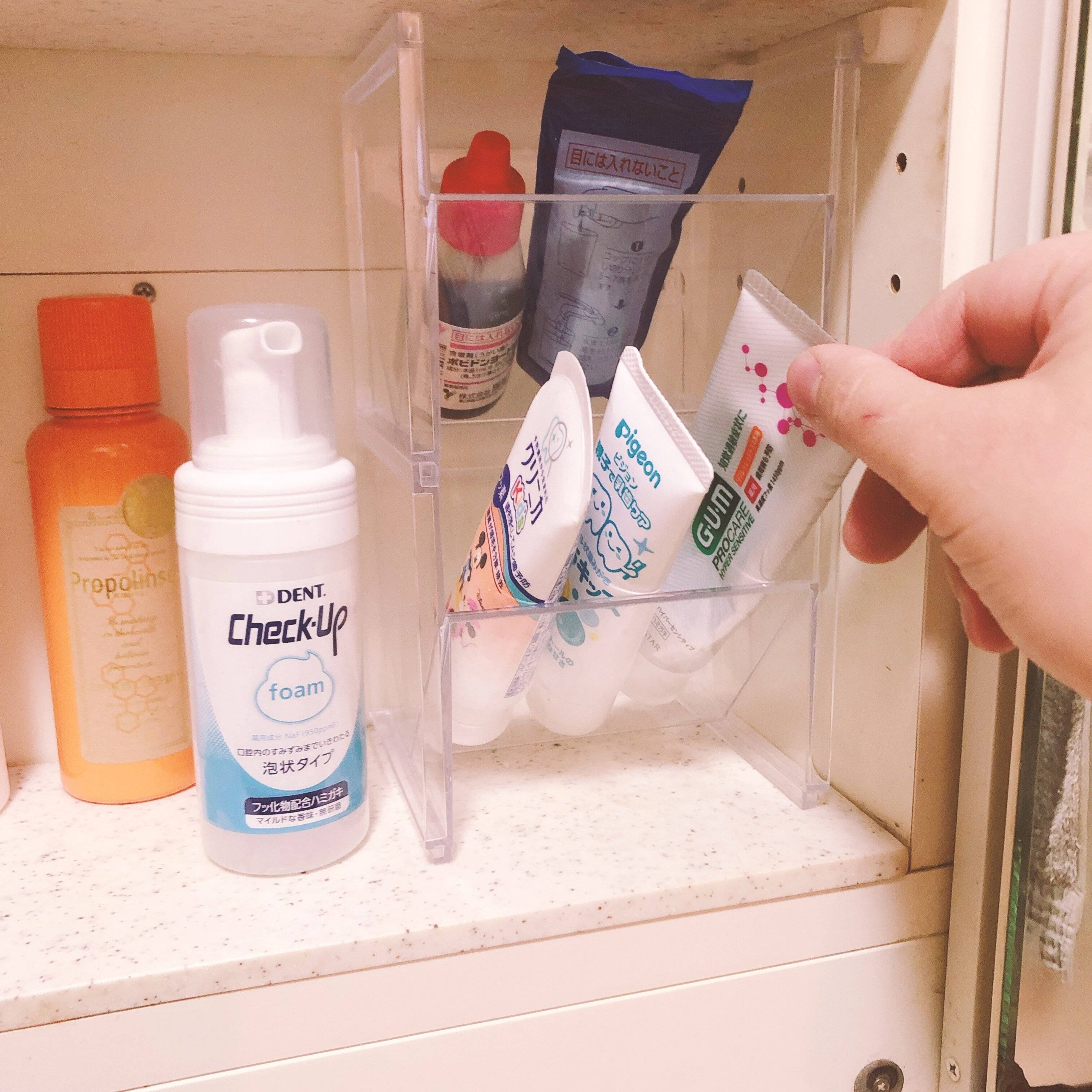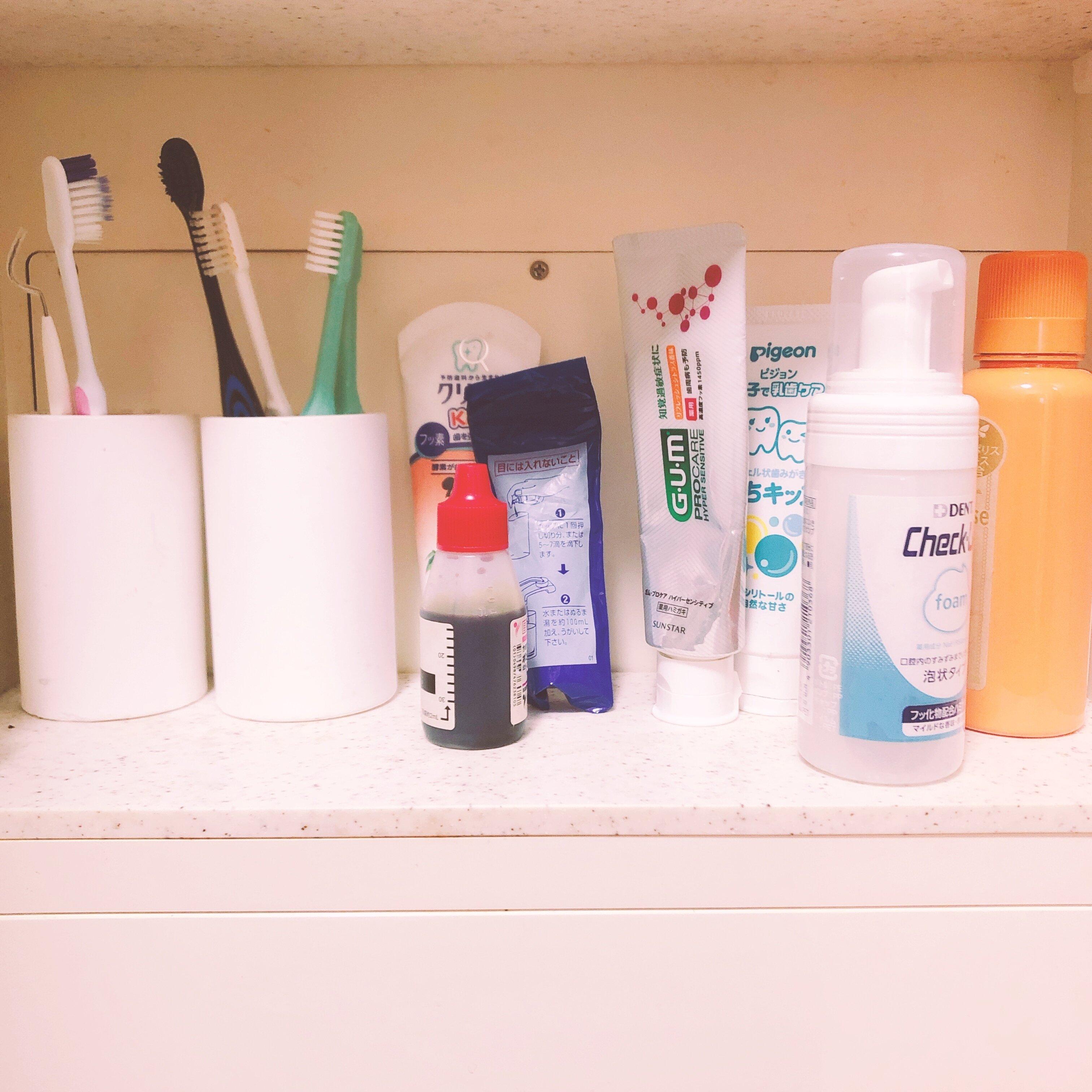 大人用の歯磨きチューブ、子ども用の歯磨きチューブ(2種類)、うがい薬などが雑然と並んでいたのですが…。