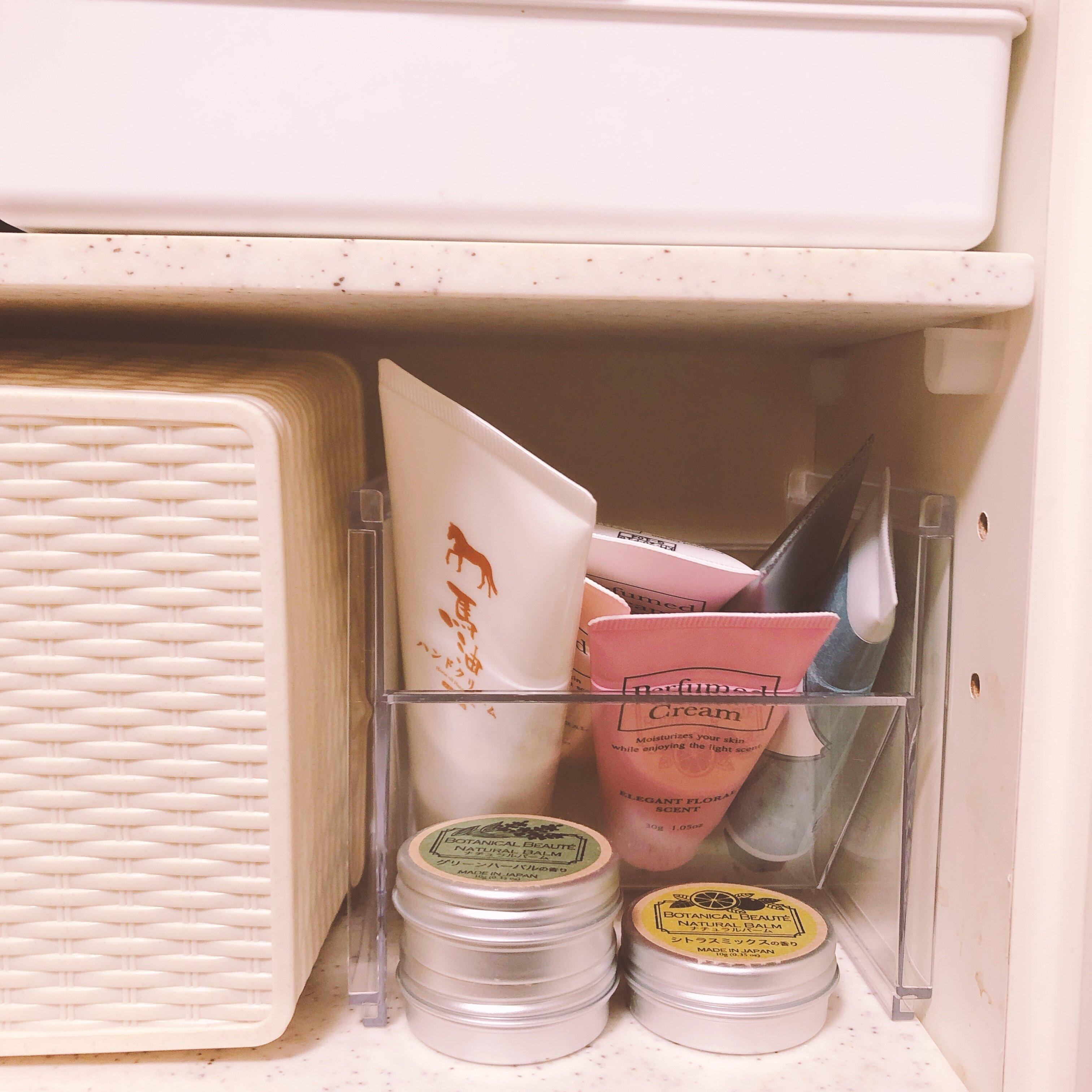 このラックは積み重ねることもできるので、上の段にはうがい薬を入れています。