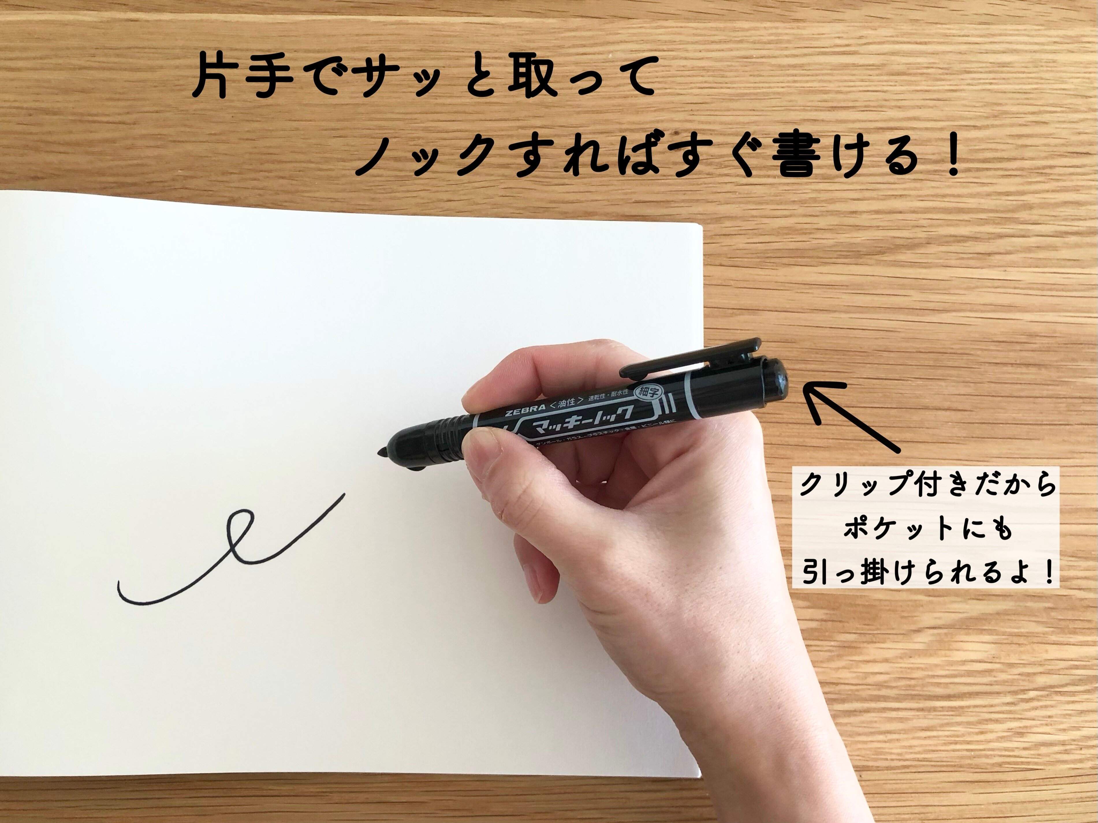 キャップ式だと、「キャップを外して」「キャップを無くさないように持って」「書いて」「キャップを閉める」という一連の動作をする必要があったんですが、ノック式はその必要が無いんです!