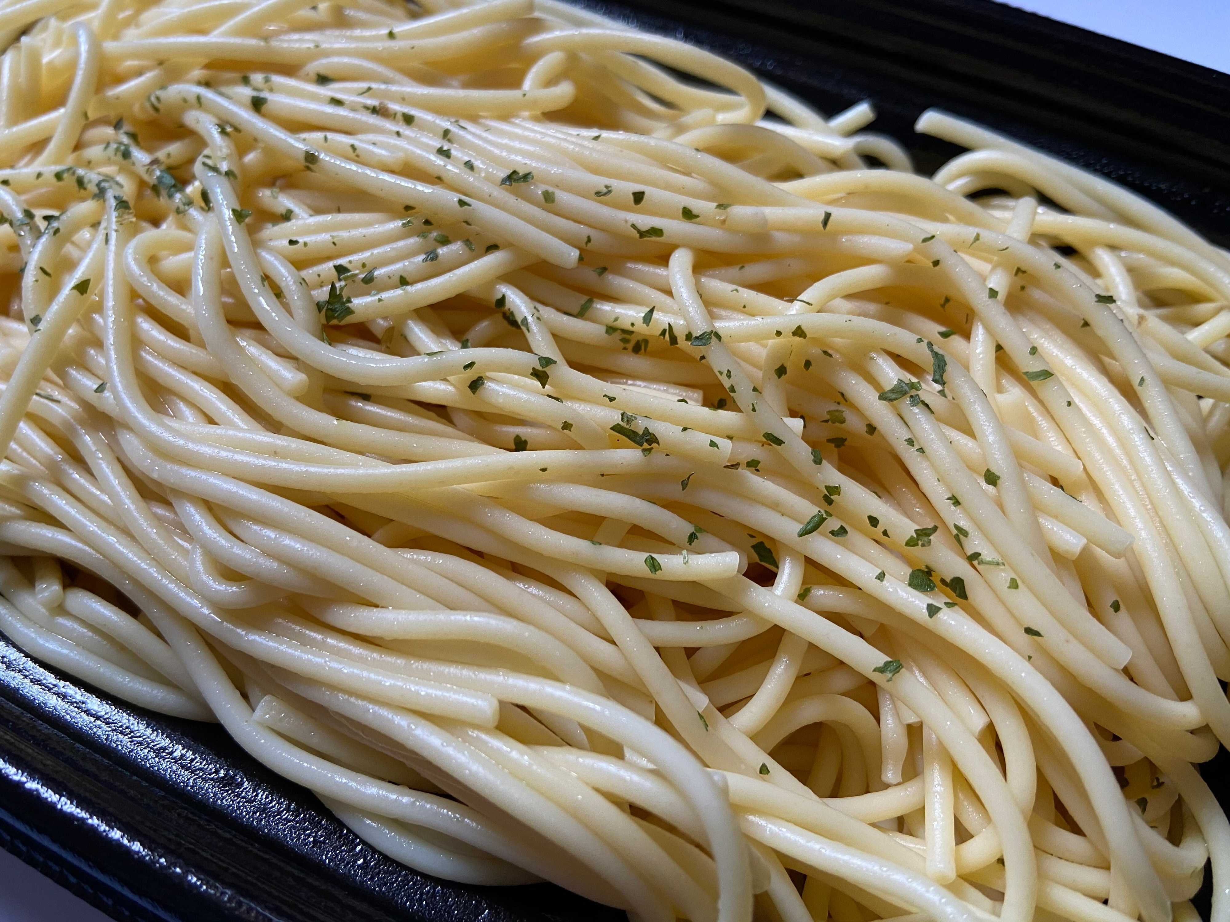 ゆでたパスタにパセリが振ってあります。1本食べてみると、本当に味はついていません!