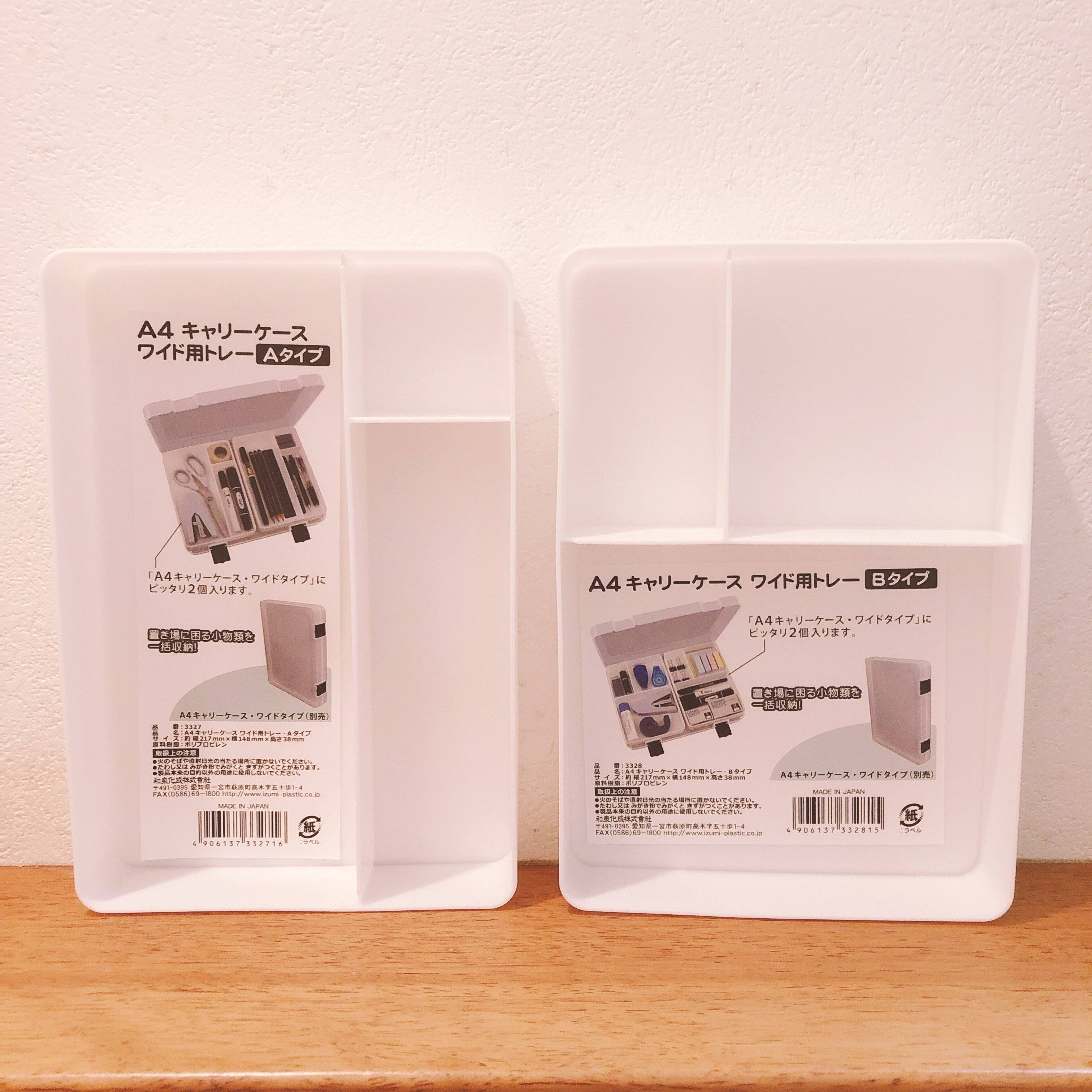 こちらが今回のオススメ商品。A4 キャリーケース ワイド用トレーです。セリアで販売されているA4 キャリーケース ワイドにぴったり2個入るサイズ。仕切りの大きさが違う2タイプがあります。