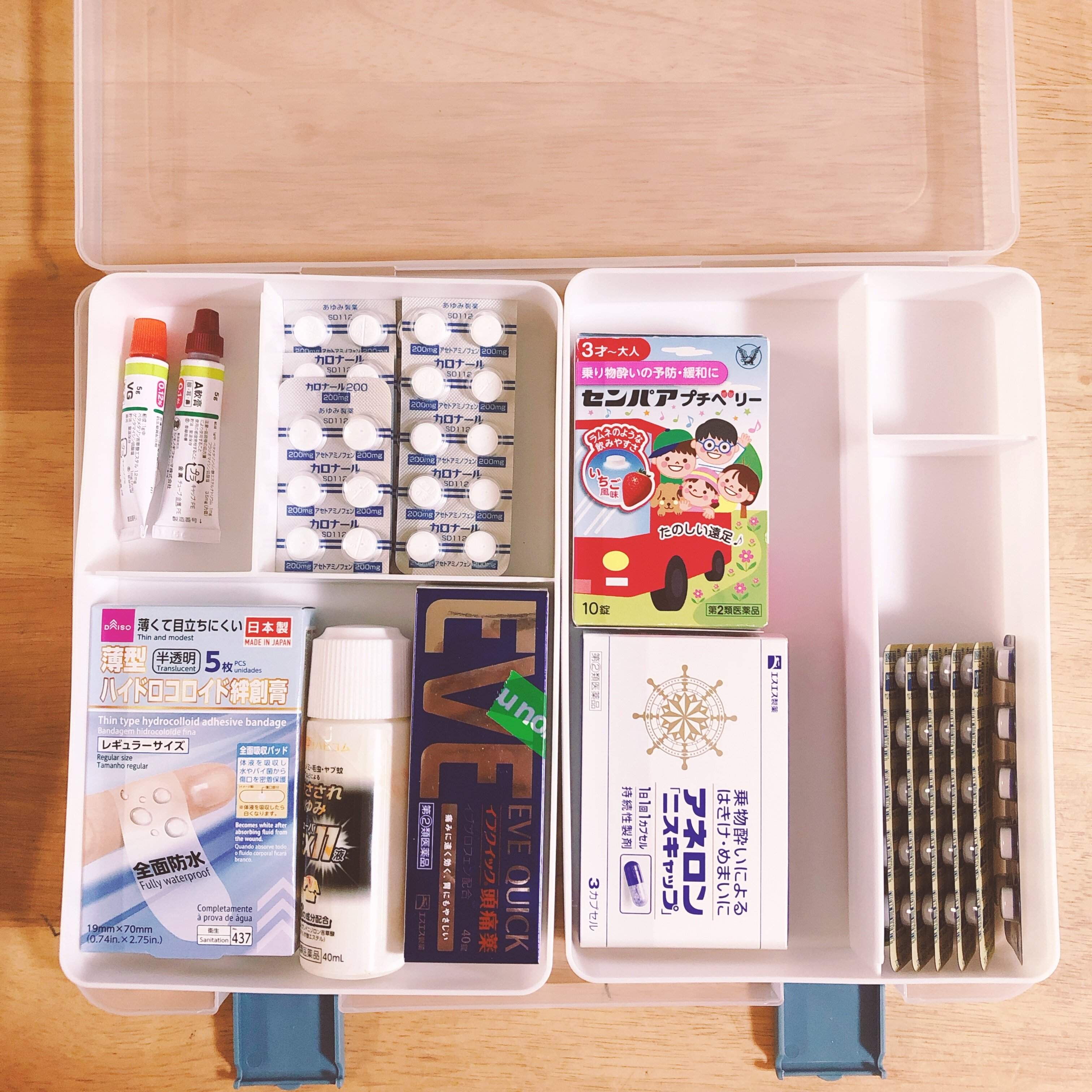 今回2セット購入したので、もう1つには薬を入れてみました。今まで薬もポイポイ収納をしていて、探すのに手間取ってしまうこともあったのですが、スッキリきれいに収納できたので探しやすくなりました。