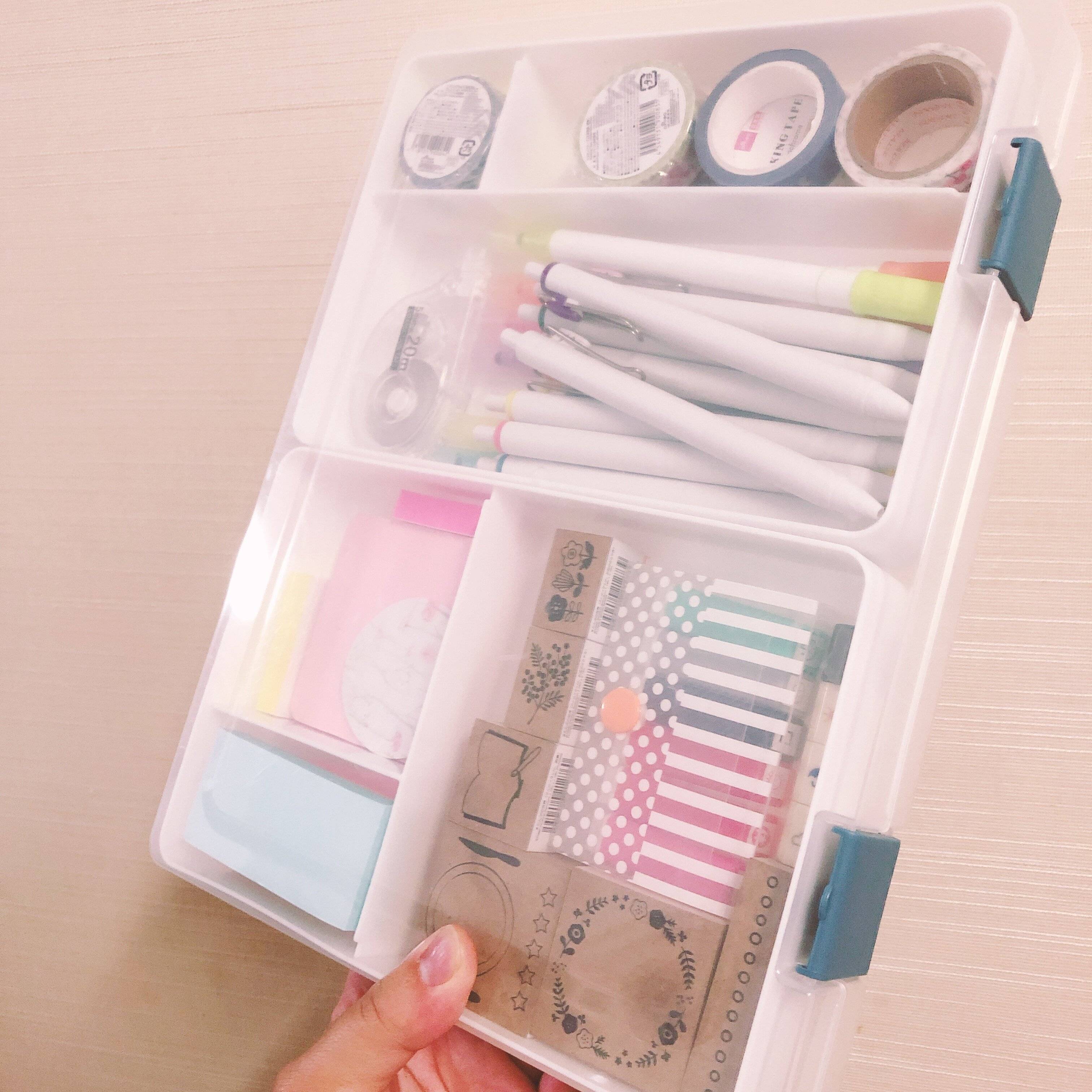 文房具を入れてみるとこんな感じです。私は手帳や日記を書くのに使うペン類や付箋、マスキングテープやスタンプを入れて見ました。トレーの高さより入れるものが多くなってしまうと、フタが閉まらなくなってしまうので、その点は注意が必要です。