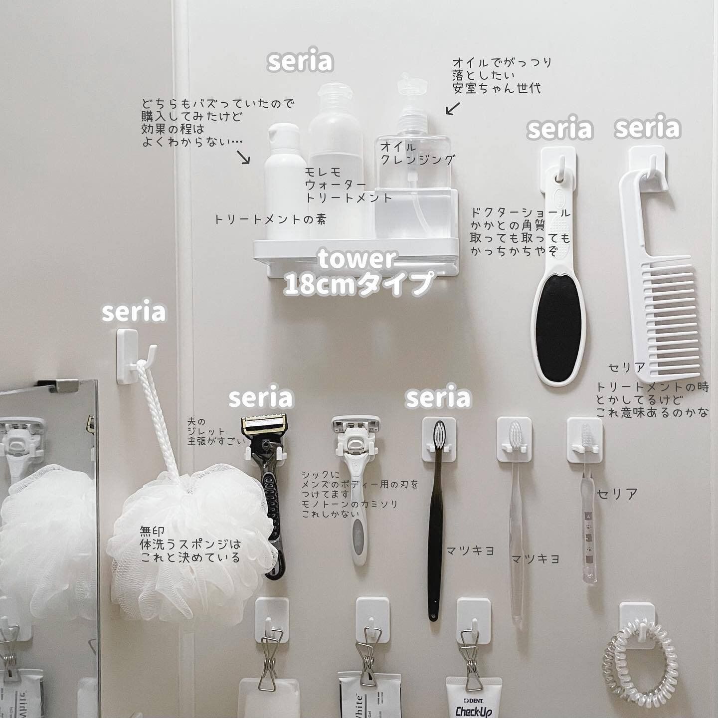 バスルームに置く小物は、少しでも衛生に保管しておきたいですよね。そこでおすすめなのが浮かす収納。自然と水切りができるため、衛生的に保管が可能です。セリアには、さまざまな浮かす収納アイテムがそろっています。歯ブラシフックやカミソリフックなど、アイテムに合ったものが展開されているため、収納のしやすさも抜群。もちろん洗面所でも活躍しますよ。