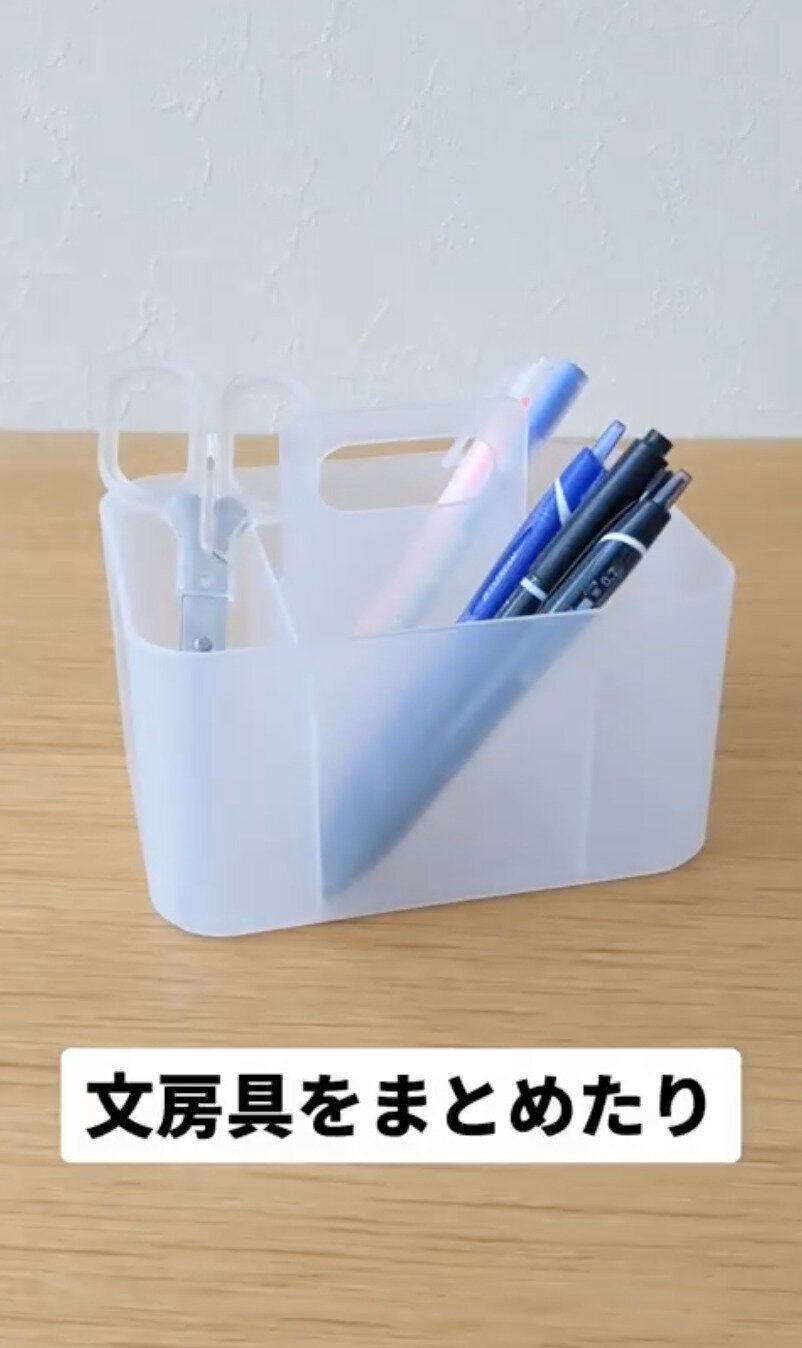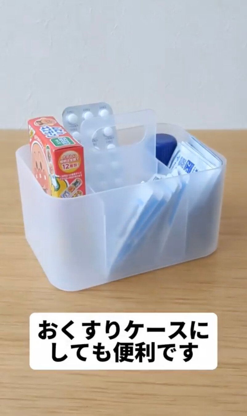 テーブルの上のちょっとした小物や、文房具、お薬などをまとめて入れておくのにちょうどいいサイズです。こちらは110円の小サイズ。220円ではありますが、ひとまわり大きめのサイズ違いもありますよ。