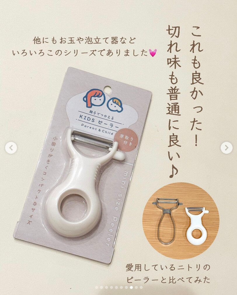 セリアで販売している子ども用のキッチングッズシリーズをご存知でしょうか?子どものキッチンデビューにぴったりなシリーズです。大人用のピーラーと並べてみると一回り小さいのですが、切れ味はいいそうですよ!ピーラーのほか、キッチンはさみやナイフ、ターナーや泡立て器などいろいろなグッズがあるので、子どもといっしょにお料理をするかたは一度チェックしてみては。