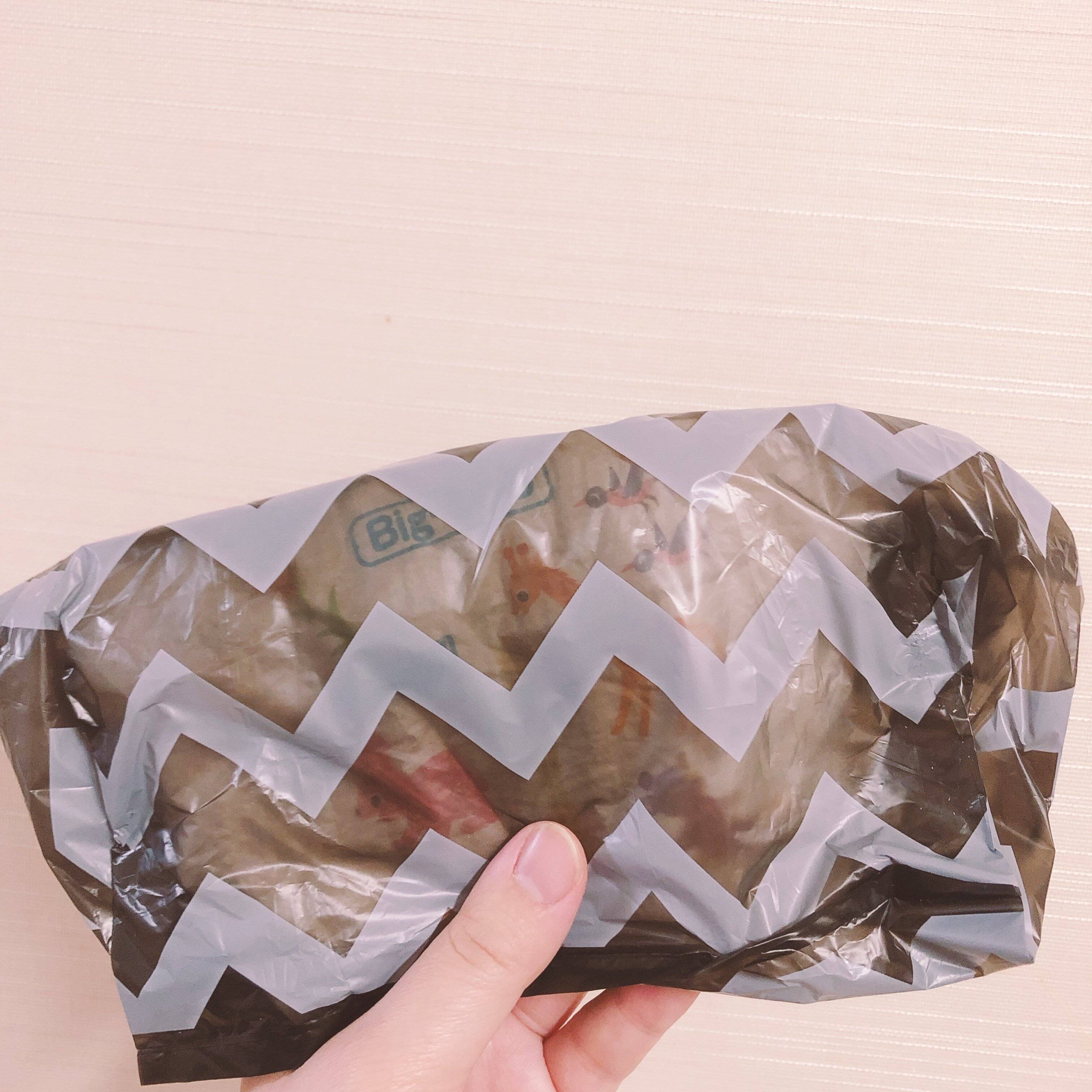子どものおむつを入れてみるとこんな感じです。全く透けないというわけではないけれど、柄なしのポリ袋と比べると透けにくいです。完全に透けなくてもいい、コスパ重視な方にはこちらがおすすめ!