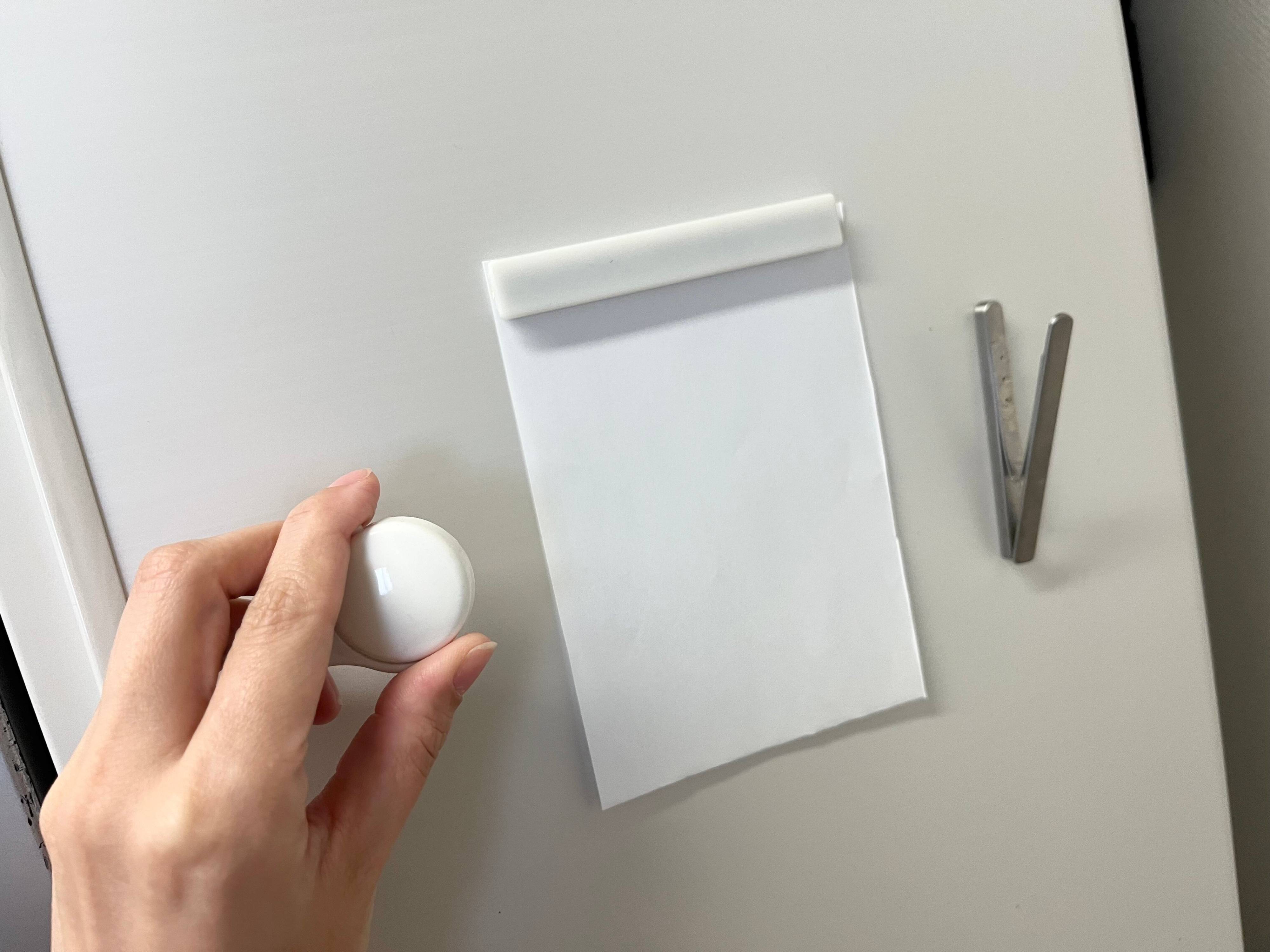 普段メモをホワイトボードや冷蔵庫にピタッと貼っておきたい時、マグネットを手に取って紙を置いて、マグネットで貼るという一連の流れの動作が必要です。ちょっとしたことですが、この動作がズボラさんにはちょっと面倒だと思う時もあるんですよね。でも「差し込みメモクリップ」を使えば、そんな必要がなくなります。
