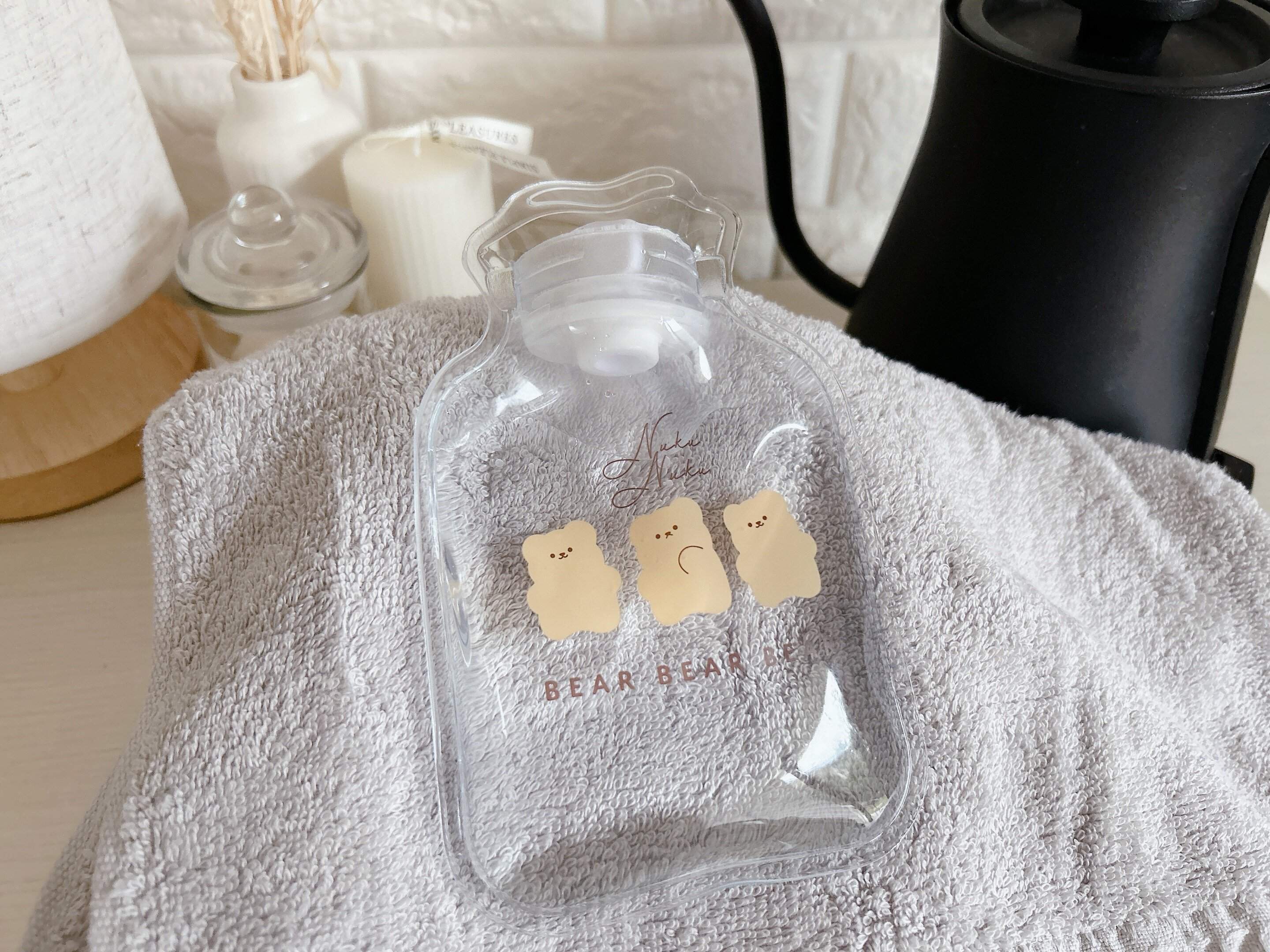 湯たんぽにお湯を入れる前に、ソフト湯たんぽカバーに入れておくと、手が熱くなりにくいです。