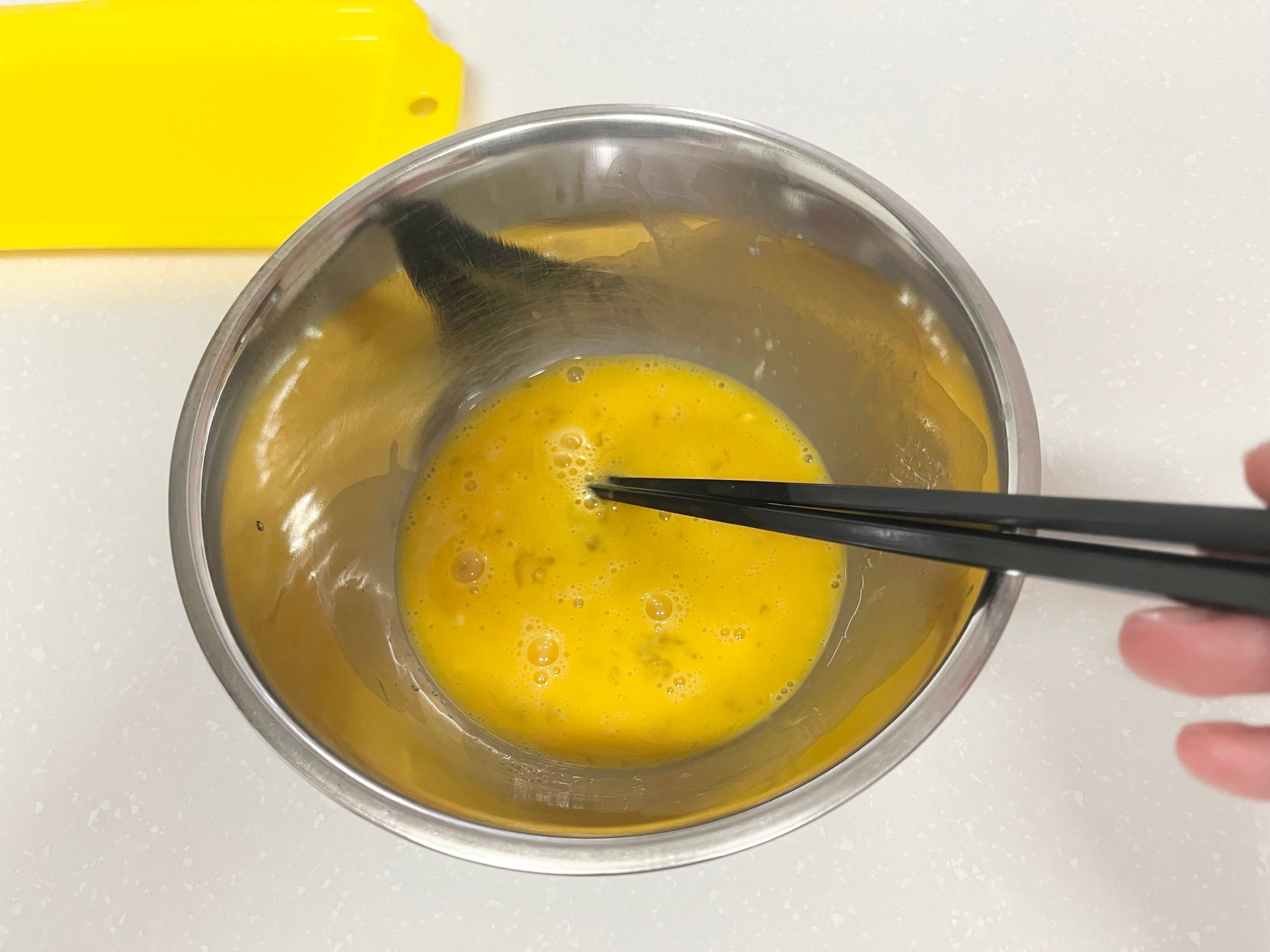 作り方はまず、ボールなどにたまご(1個)とマヨネーズ(約小さじ1)、塩(ひとつまみ)を入れてしっかり混ぜて、たまご液を作ります。