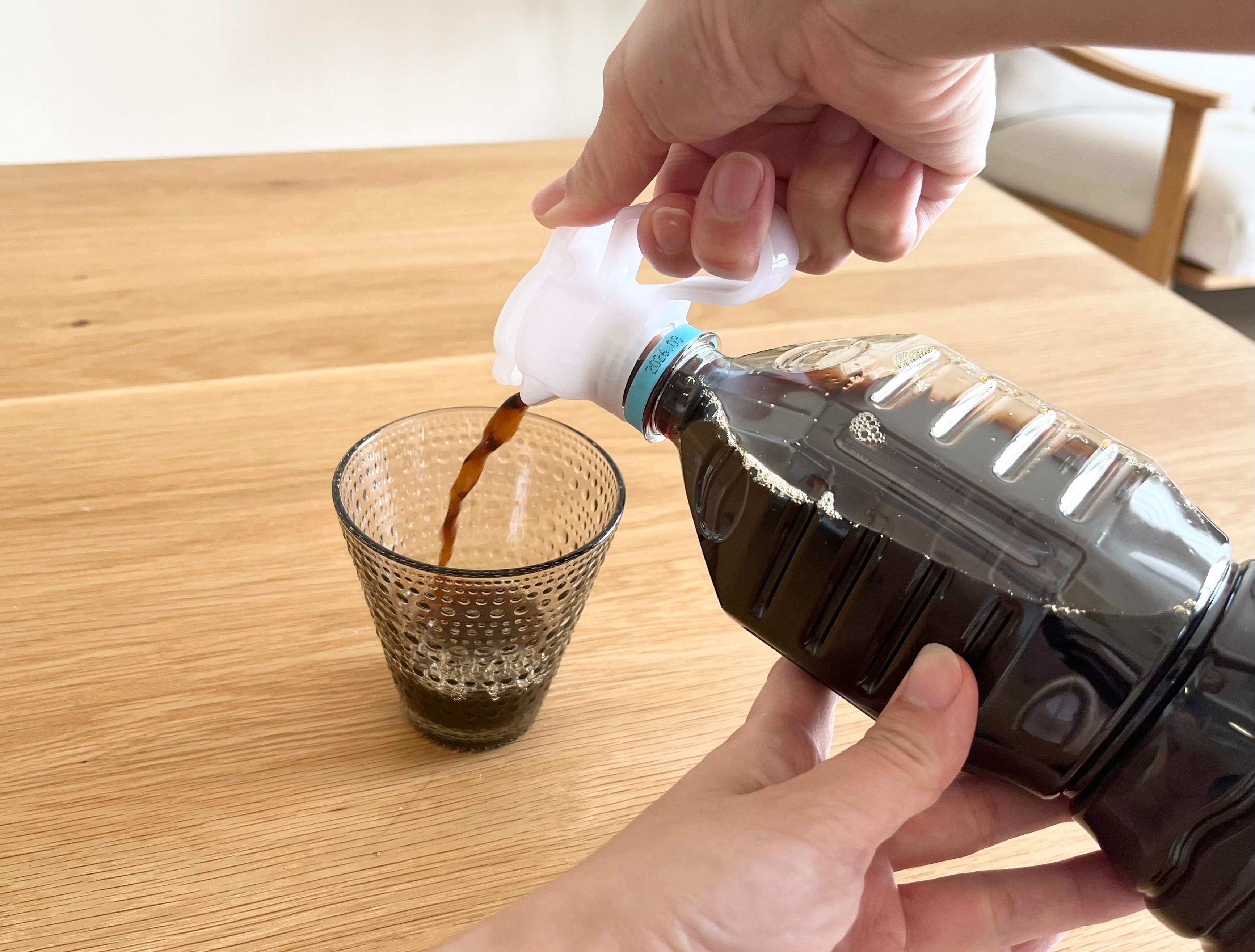 また、大きなサイズのペットボトルに入った飲料をコップに注ぐ時、重くて不安定になるから勢いよくドバっと出て飛び散ってしまうことってありますよね?ですが、こちらの商品を取り付ければ、注ぎ口が細くなるので飛び散りにくくなります。