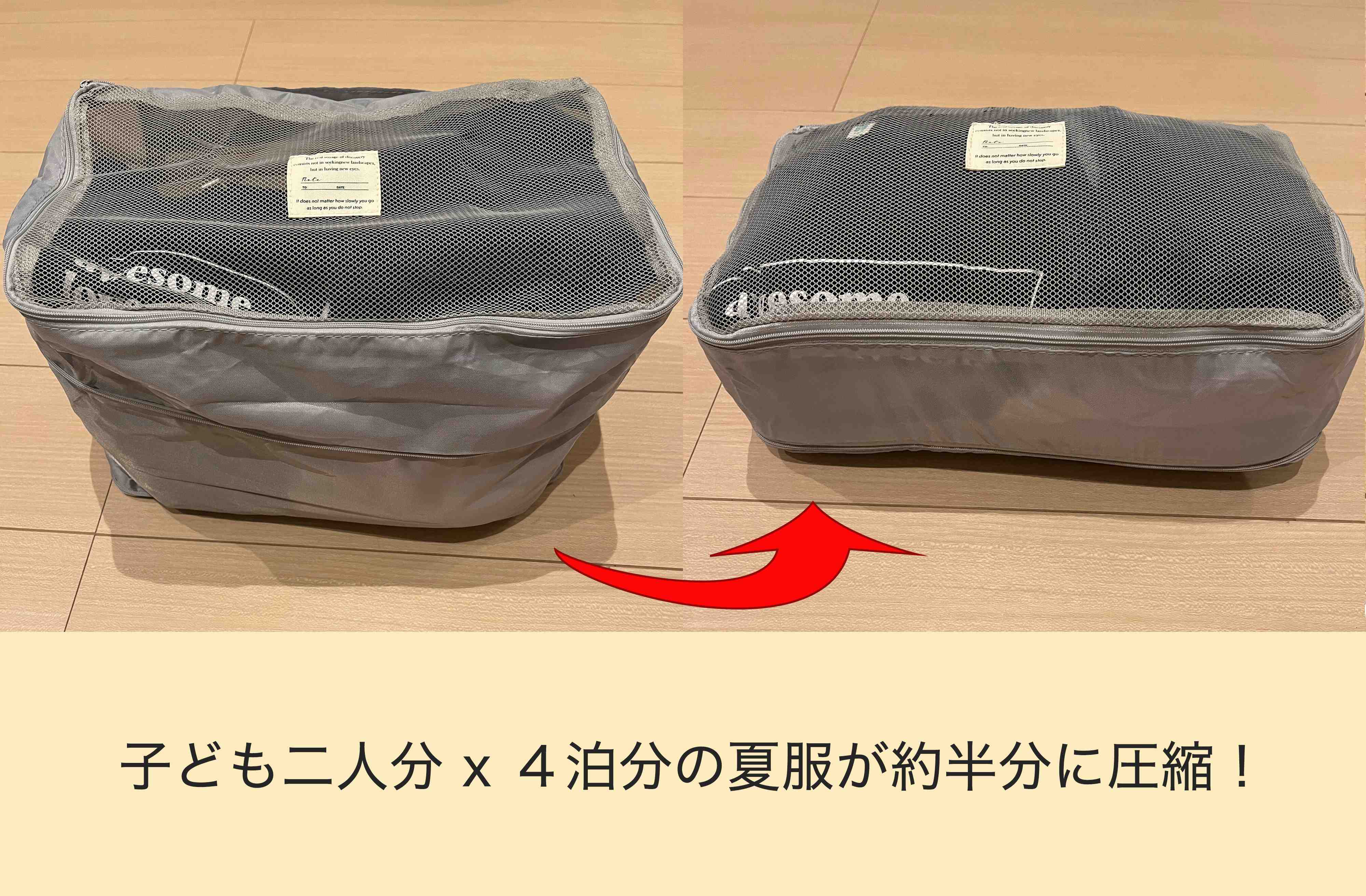 下側についているファスナーを閉めながら圧縮していくことができるので、かさばる服をコンパクトに収納でき、スーツケースの小スペースに収まりました。