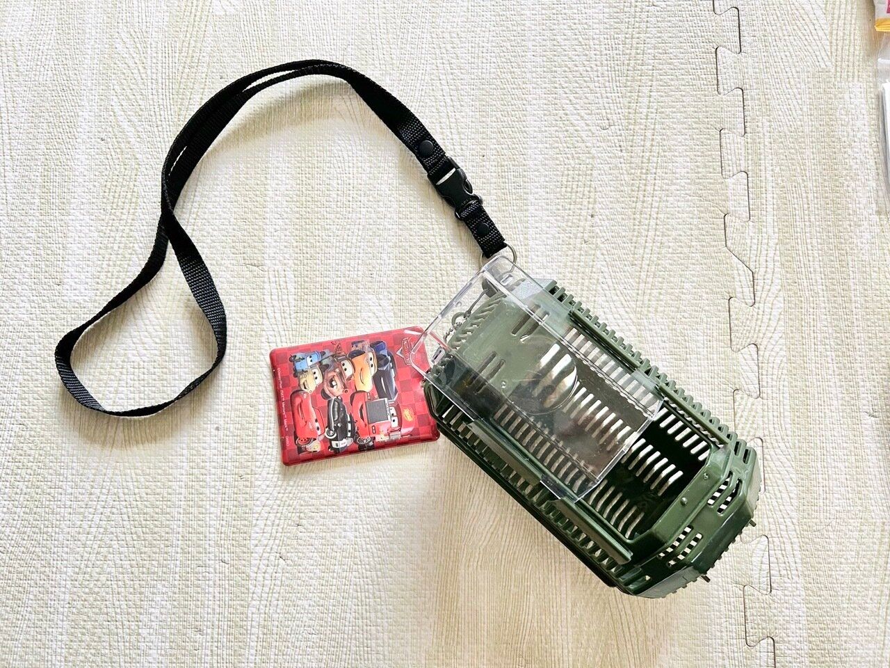 代用できるものを探していたところ、ダイソーで販売している虫かごを発見。スライド式なので子どもでも開け閉めができてストラップで斜めがけにできると感じたのでこれで子ども用防災セットを作りました。