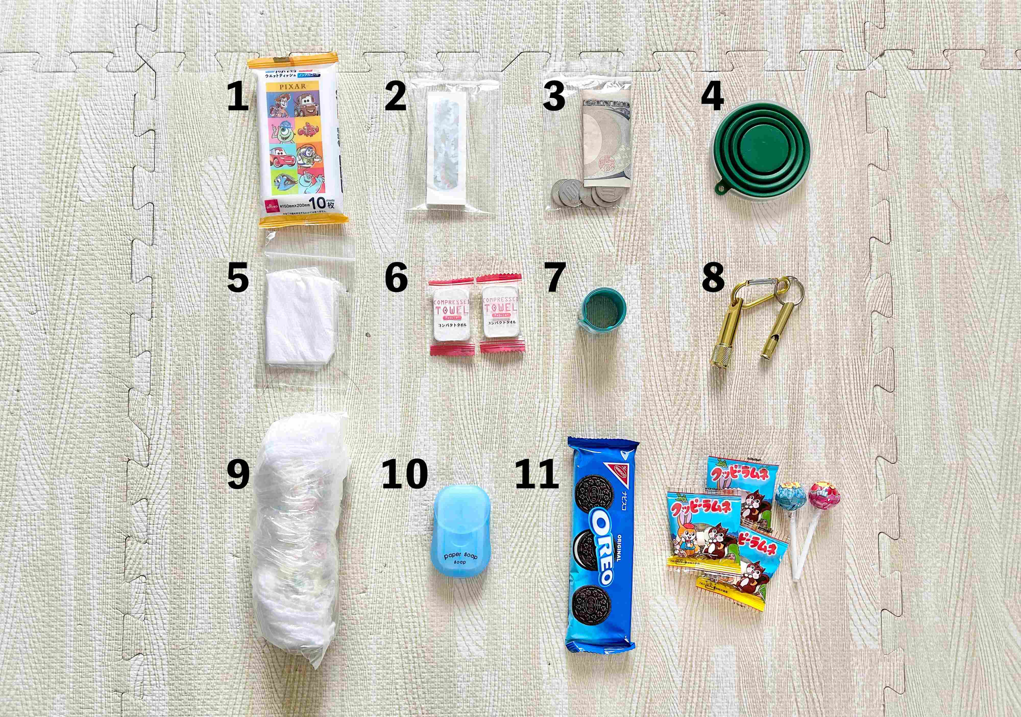 おむつとおやつ以外のアイテムは全てダイソー商品です。