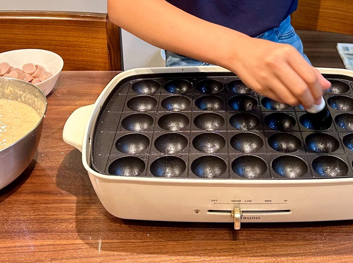 油引きといえば「たこ焼き」。早速、子どもにお手伝いしてもらいました。「丸くて使いやすい!たこ焼きのためにハケがあるんだね!」と感動を伝えていました。もちろん、日々の焼き物料理や、卵焼きにも大活躍。