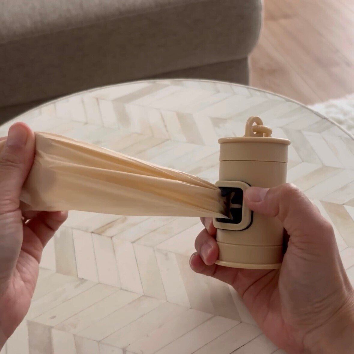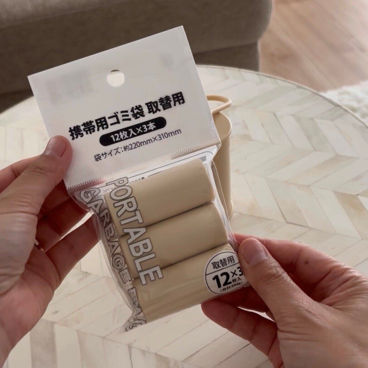 ケースも袋もベージュで、見た目の感じも私好みの携帯用ゴミ袋。