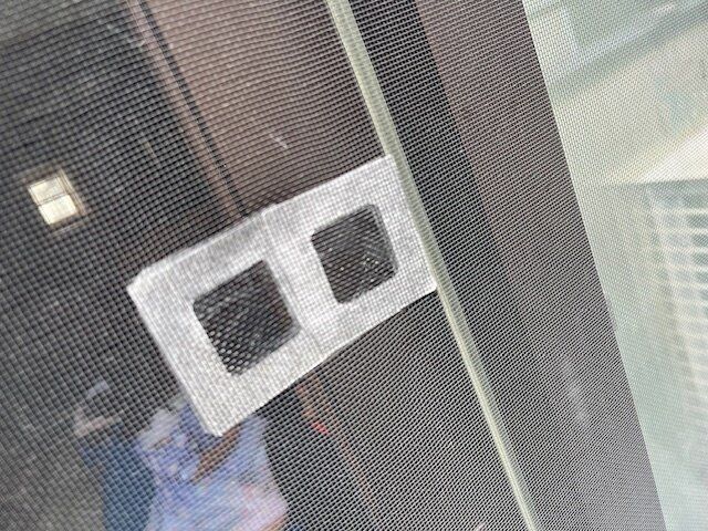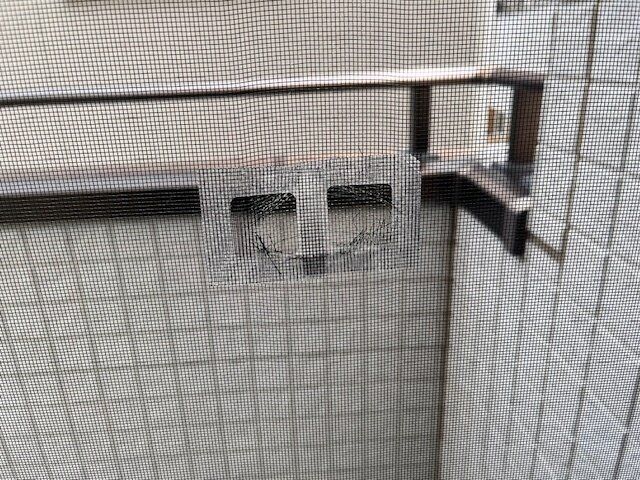 我が家のリビングの網戸。なぜかこんなところに穴が空いてしまいました。