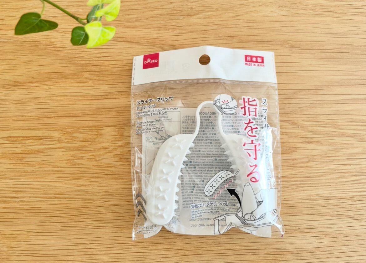 ご紹介するのは、ダイソーの「スライサーグリップ」という商品。おろし器やスライサーを使う時、うっかり怪我をしないようにする為に、刃から指先をガードできる便利なキッチングッズです。価格は110円で販売されています。