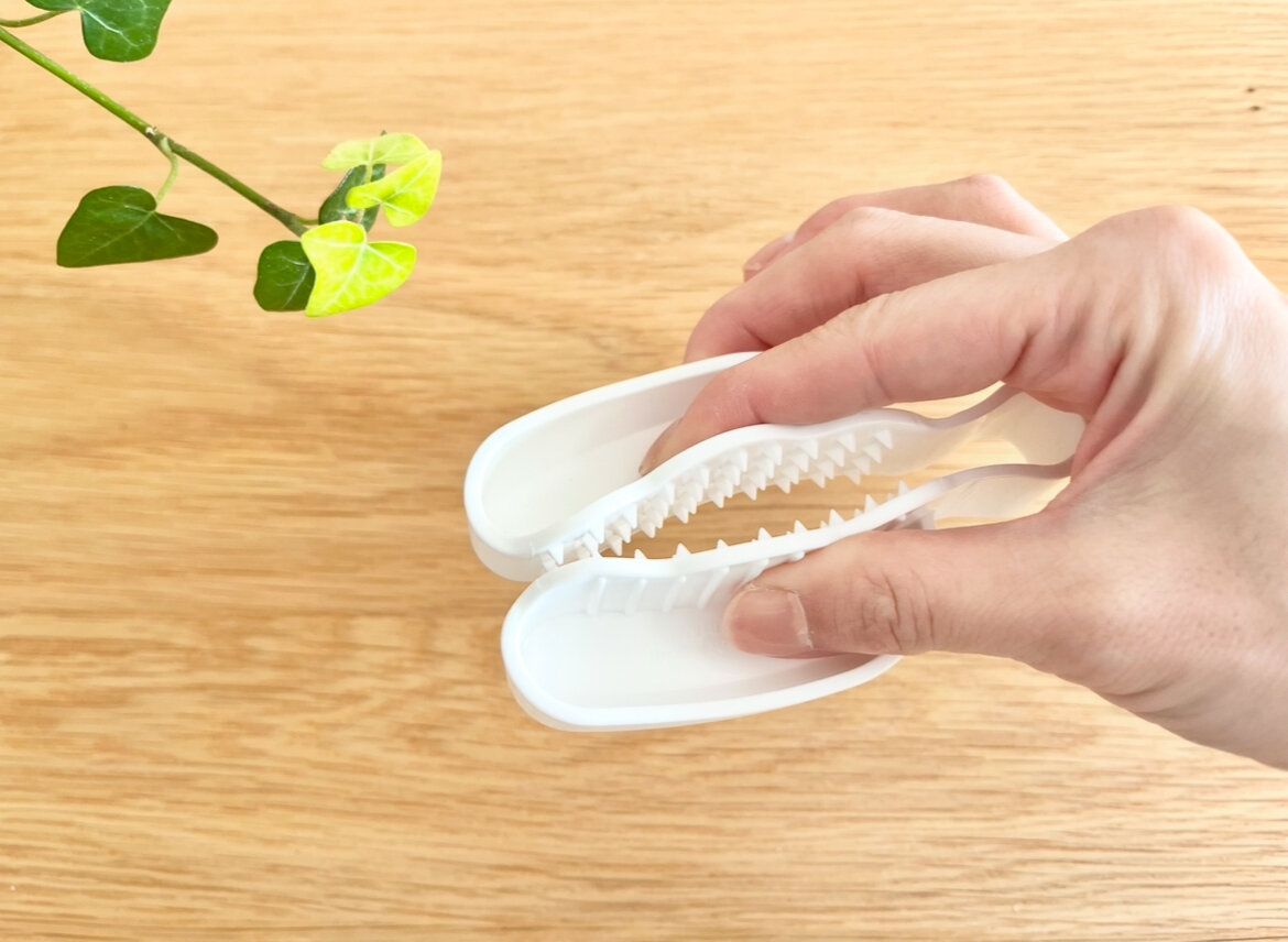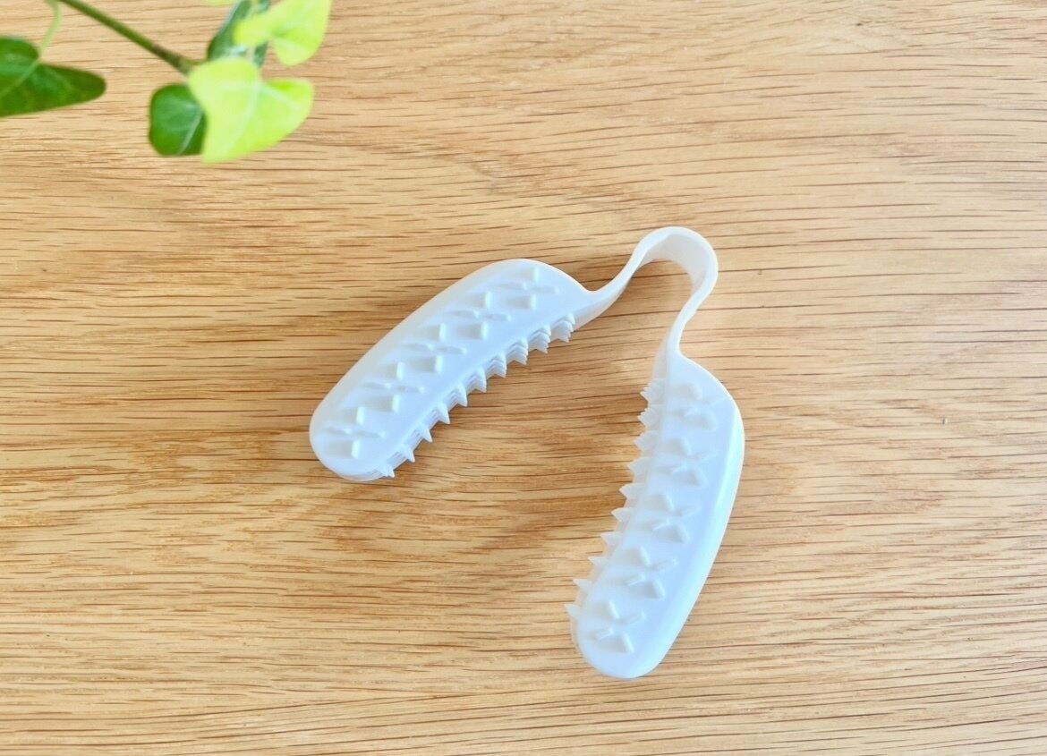 こちらの商品のサイズは、約10.2cm ×9.8cm ×2.7cm。カラーはシンプルなホワイトで、素材はポリプロピレンを使用。そして表面にはトゲのような突起がたくさん付いていて、なんだか少し変わった小さいトングのようなデザインをしています。