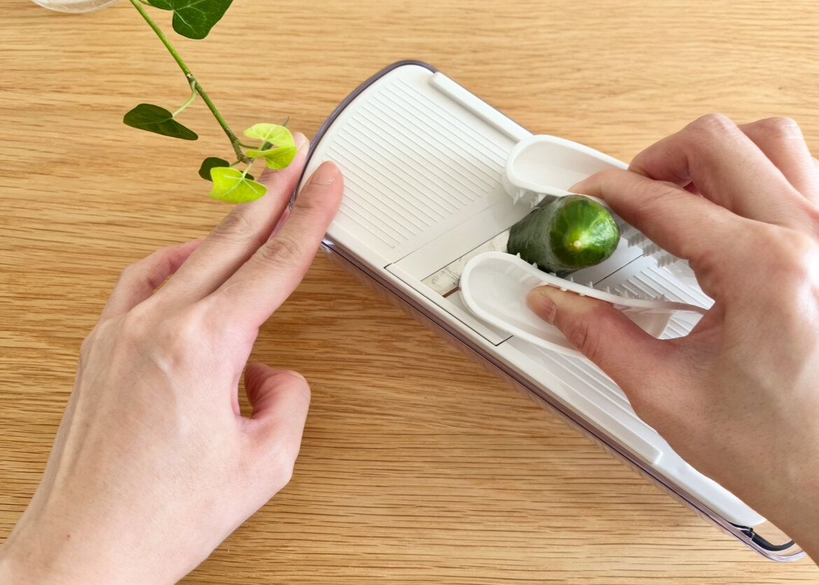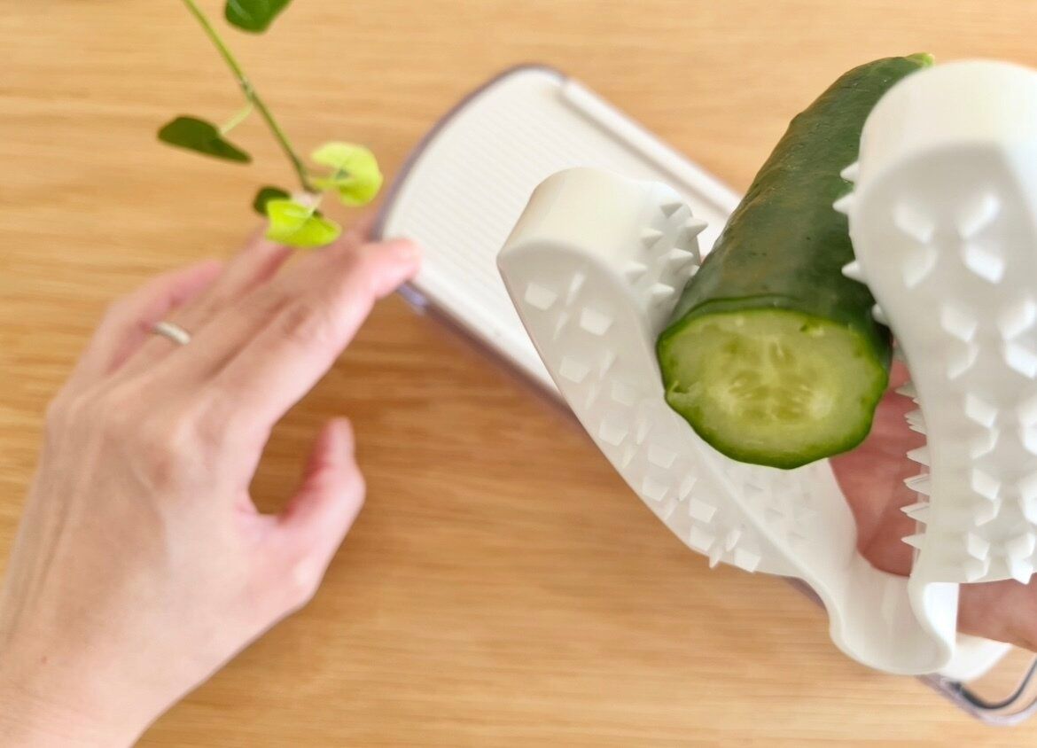 実際にスライサーできゅうりをスライスしてみましたが、トゲのような突起のお陰でしっかり野菜を挟めるのが好印象!