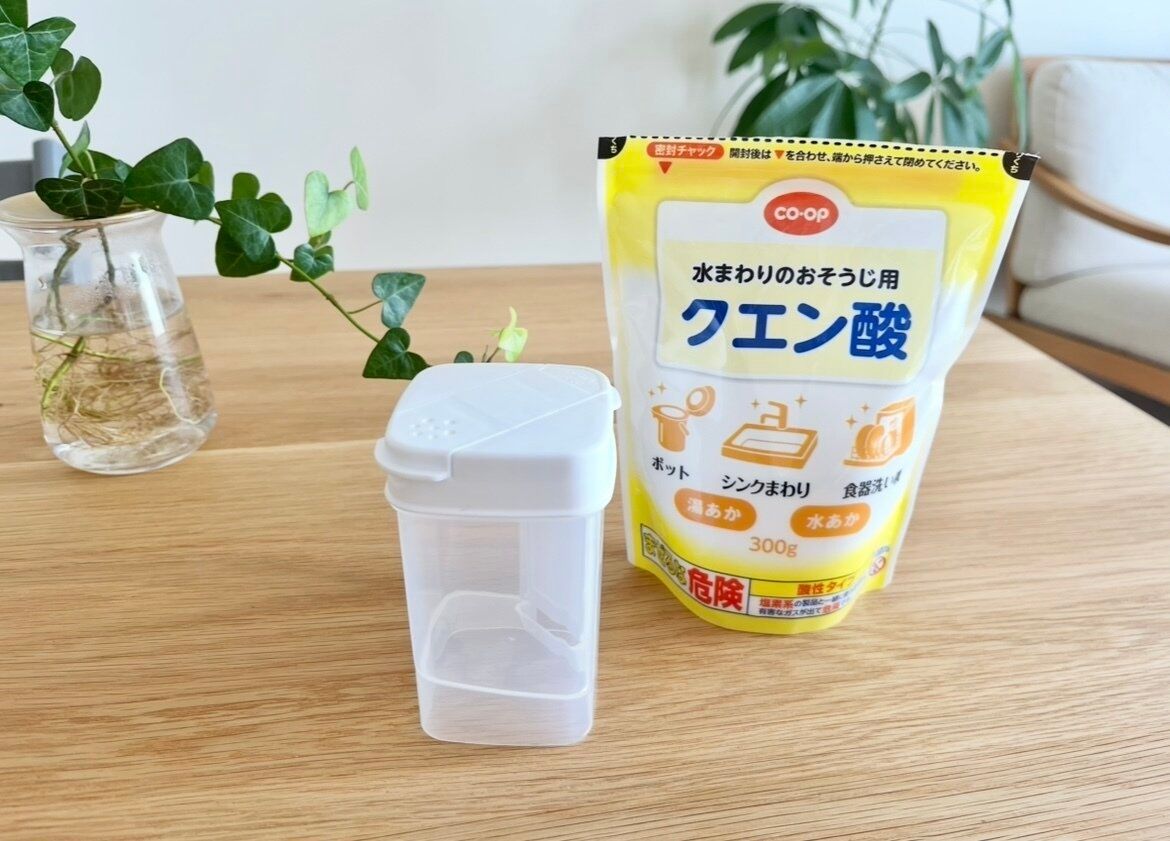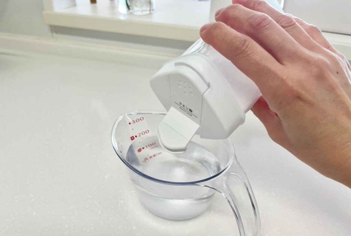 実際に、クエン酸をボトルで計量してクエン酸水を作ってみました。蓋を開けて必要な分だけ振り掛けるだけなので、本当に超簡単!今まで計量スプーンを使っていましたが、そんな手間もいらないし、片手でワンアクションで計量できちゃいますよ。