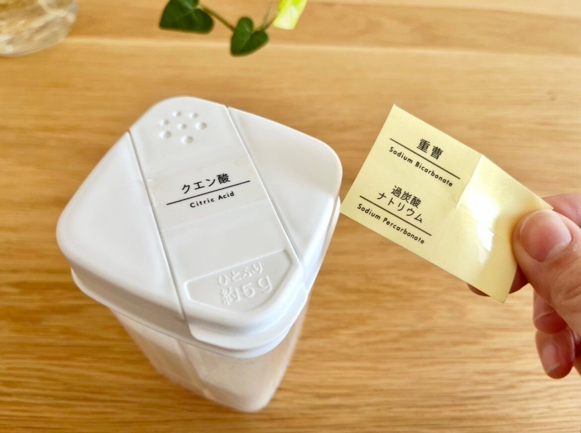更にもう1つ便利なのが、ボトルに貼って使えるラベルシールまで付いているというところ!ラベルシールには粉末洗剤でよく使う、重曹・クエン酸・過炭酸ナトリウムの他に、書き込みできるフリーシールも付いています。まさに至れり尽くせり!