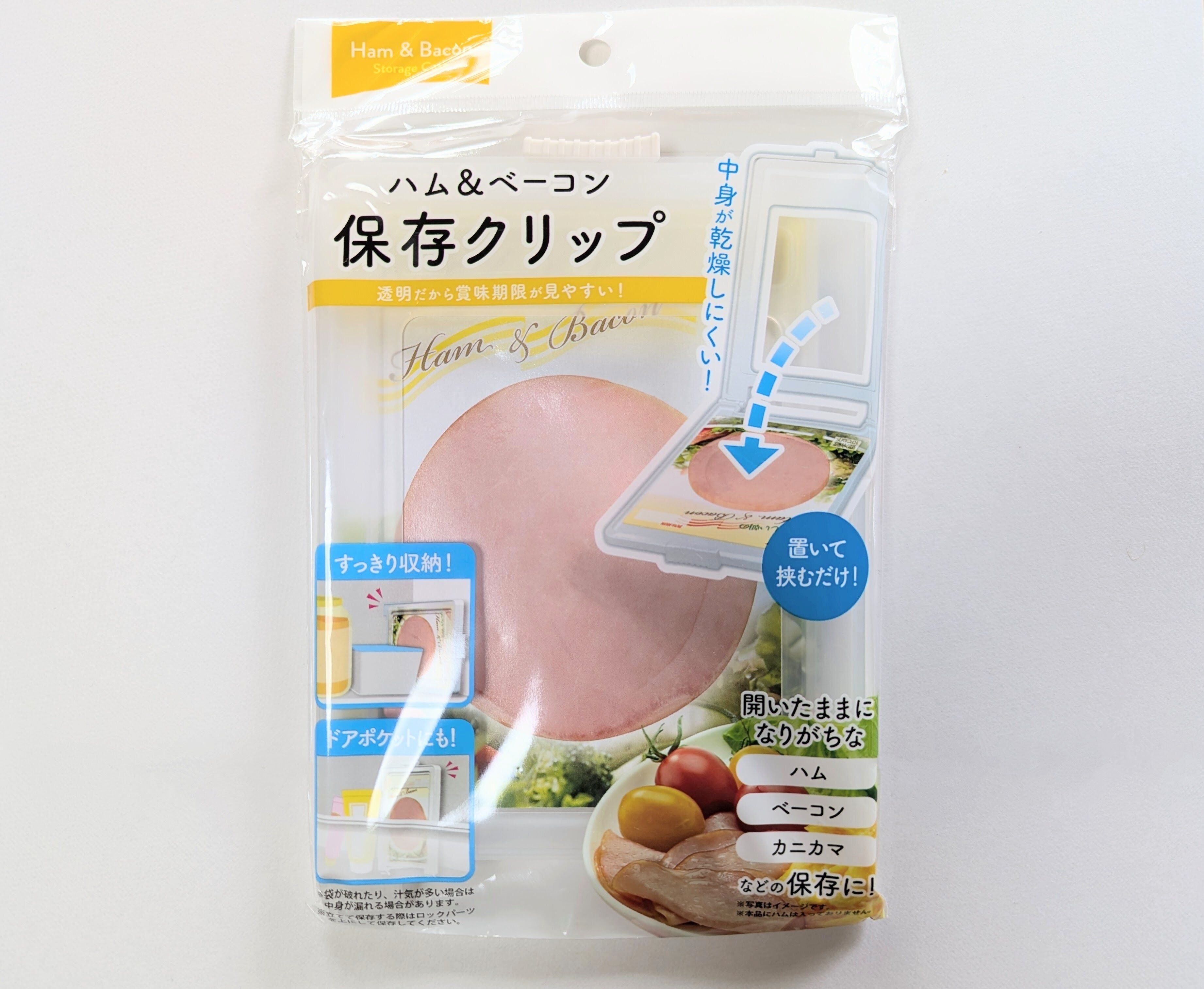 開封済みのハムやベーコン、カニカマなどをパッケージごと挟むだけで、乾燥を防げる便利グッズです(110円・JANコード:4905687384190)。横135mm×縦170mmまでの標準的なパッケージに対応していますが、横幅が多少はみ出す程度は大丈夫。