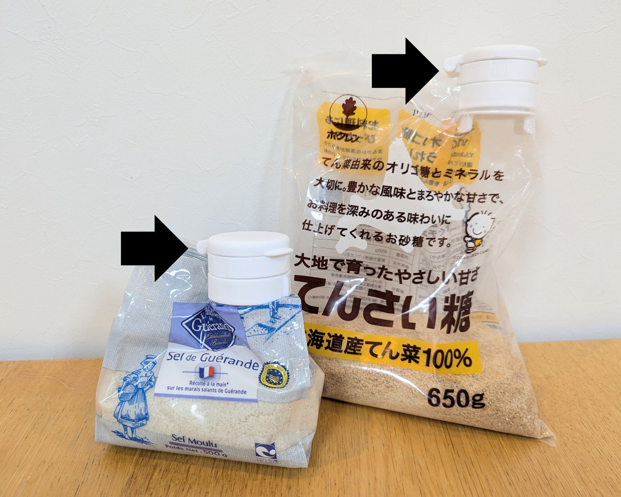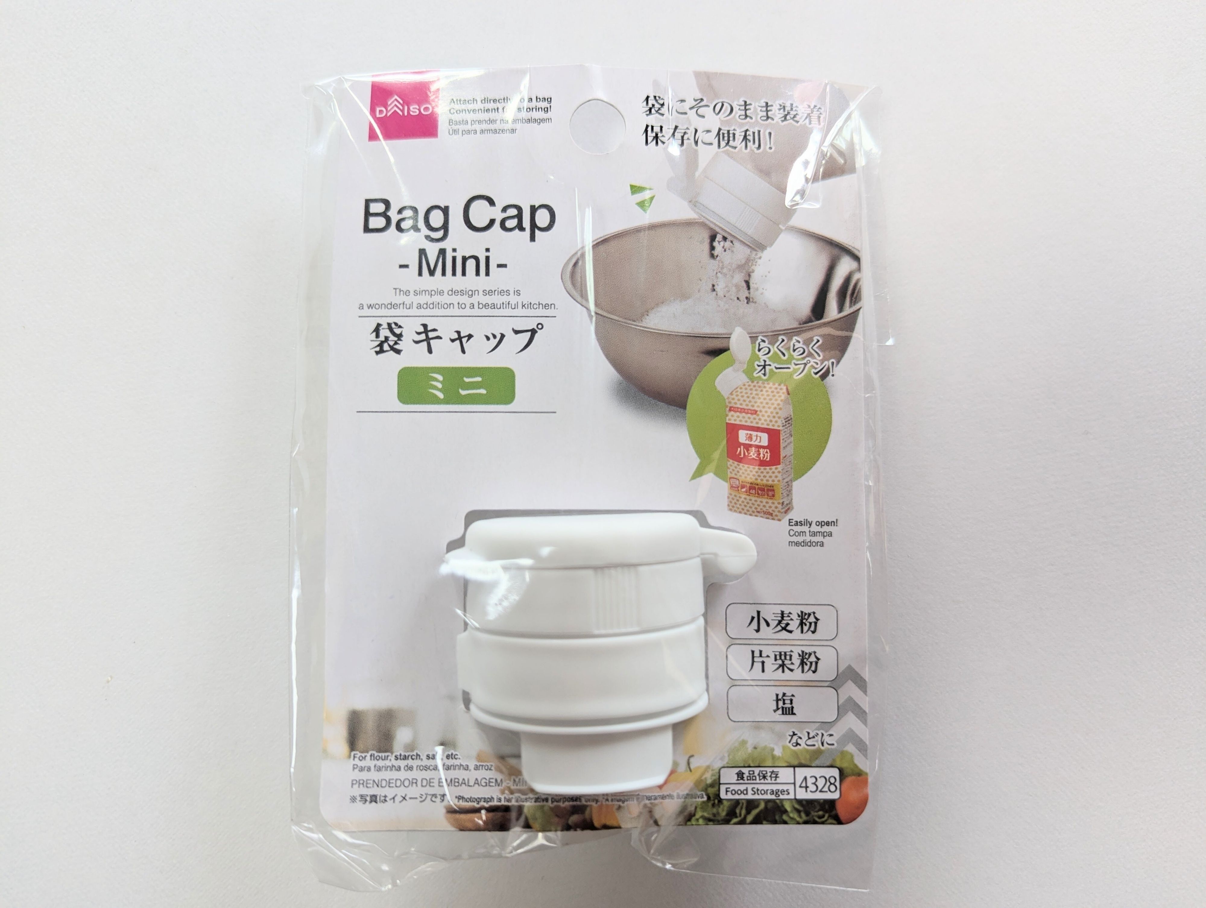 小麦粉や砂糖、塩など、袋入りの食品に取りつけて、キャップとして使えるアイテム(110円・JANコード:4550480094328)。わたしは、保存容器に入りきらなかった砂糖と塩の袋につけて使っています。