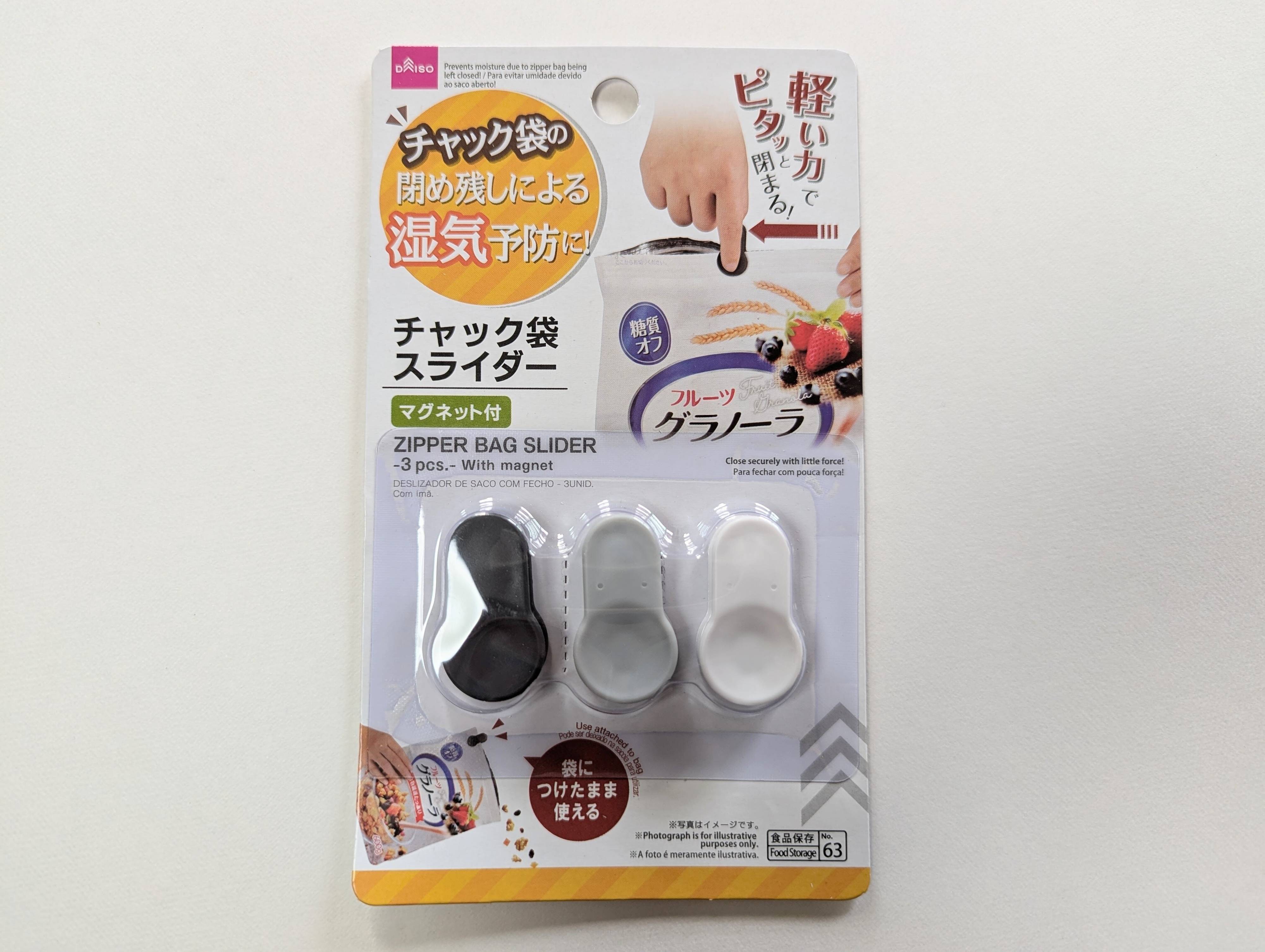チャック袋につけるだけで、チャックが閉めやすくなり、閉め残しによる湿気も防げる便利グッズ(110円・JANコード:4549131906738)。わが家では、グラノーラと韓国のりの保存に重宝しています。
