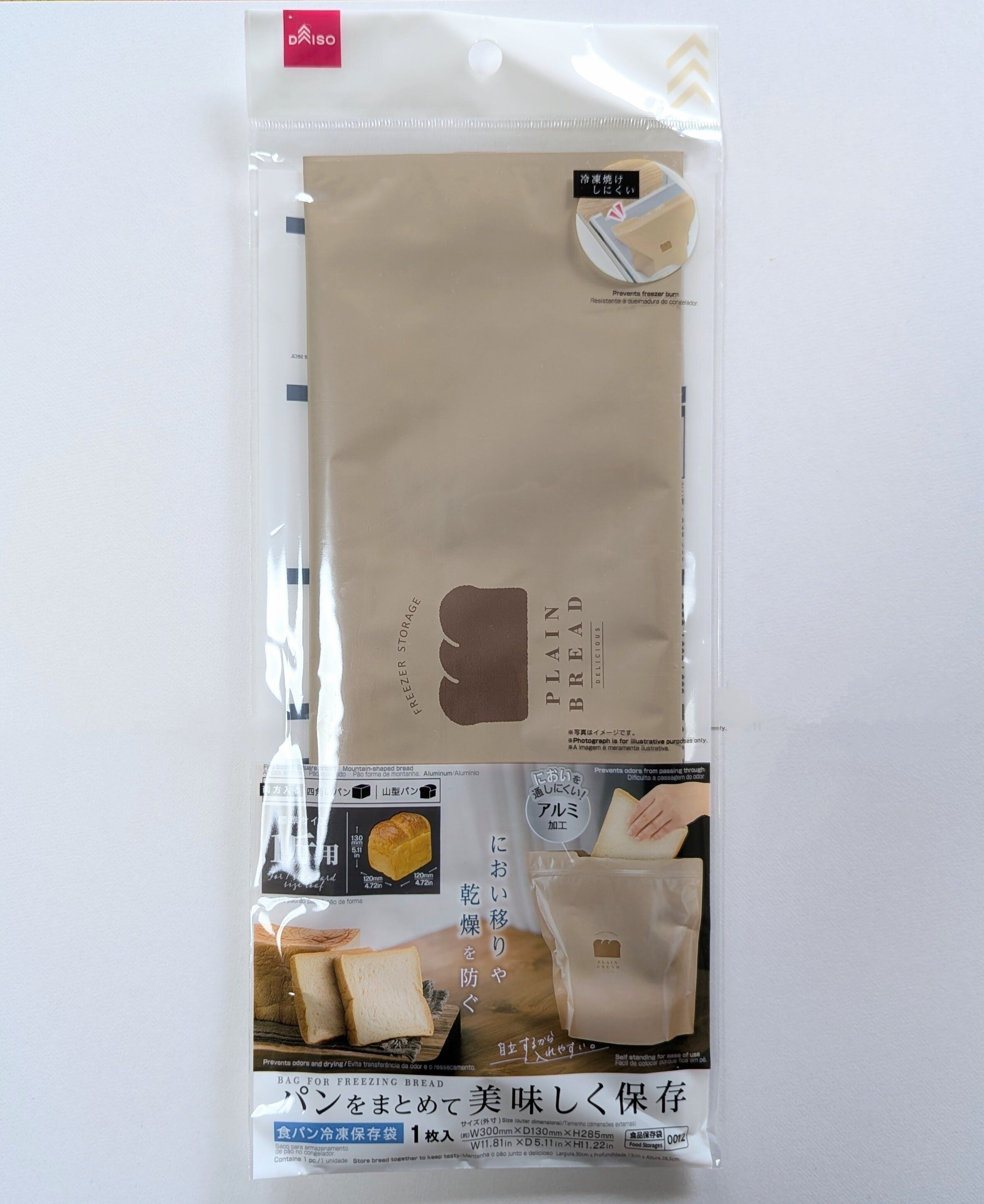におい移りや乾燥を防いで、1斤の食パンをおいしく冷凍保存できるアイテムです(110円・JANコード:4550480340012)。洗って繰り返し使えるのも◎。
