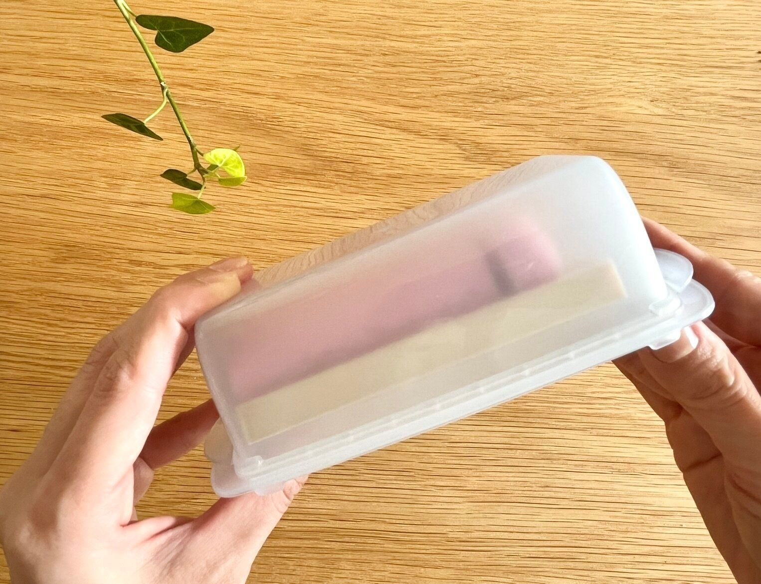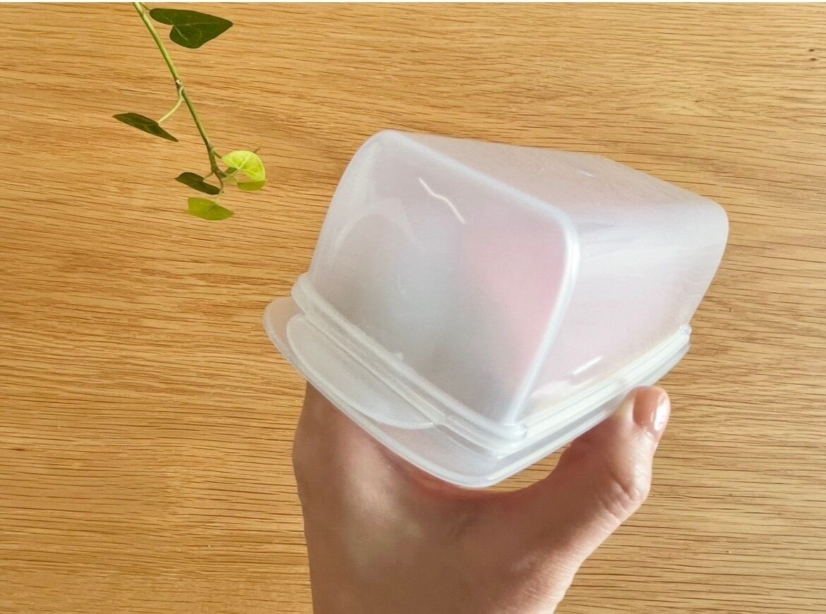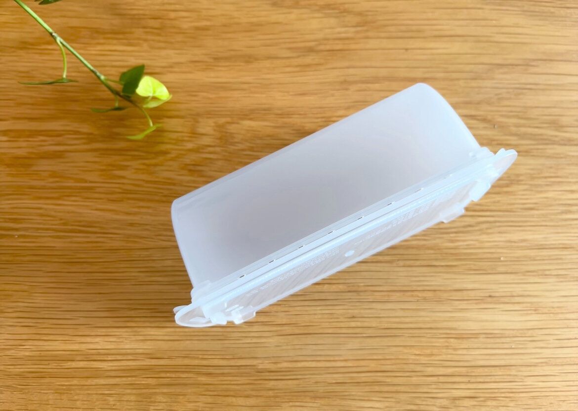 こちらの商品は、蓋の方に厚みがある少し変わったデザインの専用ケースです。なんだかごく一般的な保存容器を、上下逆さまにしたようなデザインですよね?