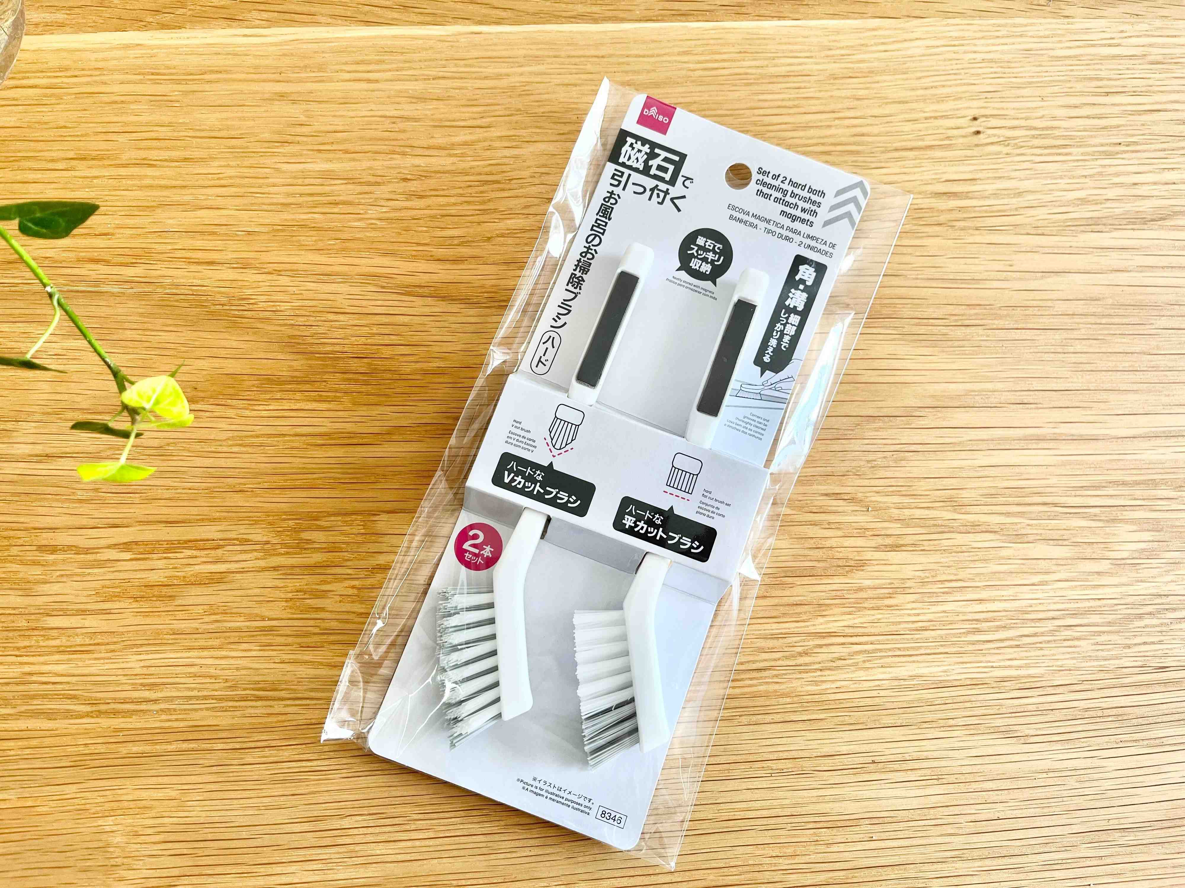 最初にご紹介するのは、「磁石で引っ付くお風呂のお掃除ブラシ(ハード、2本)」という商品。2本セットで110円で販売されています。