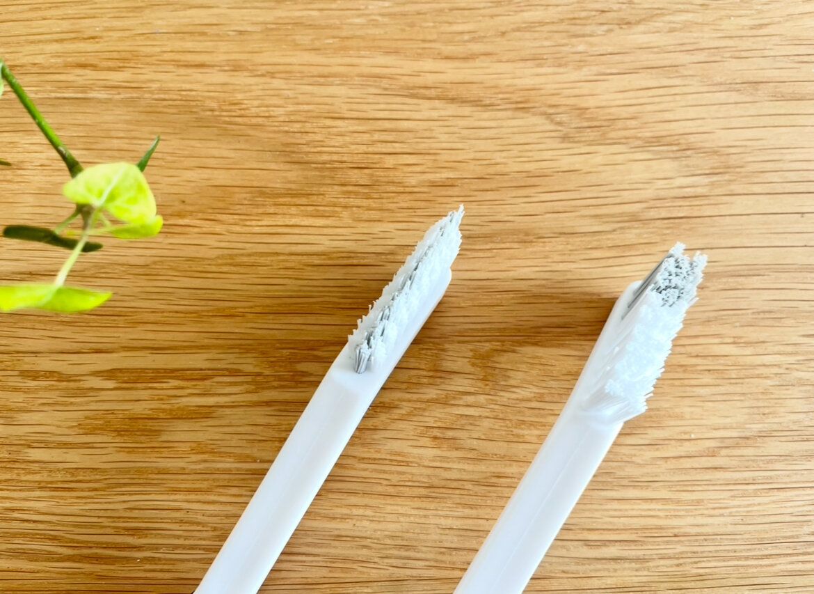 こちらの商品はどちらも約4cm×18.2cm×1.5cmという大きさですが、ブラシの先端が少し違っています。よく見るとブラシのカットの仕方が違っていて、平にカットされたブラシとV字にカットされたブラシが各1本入っています。
