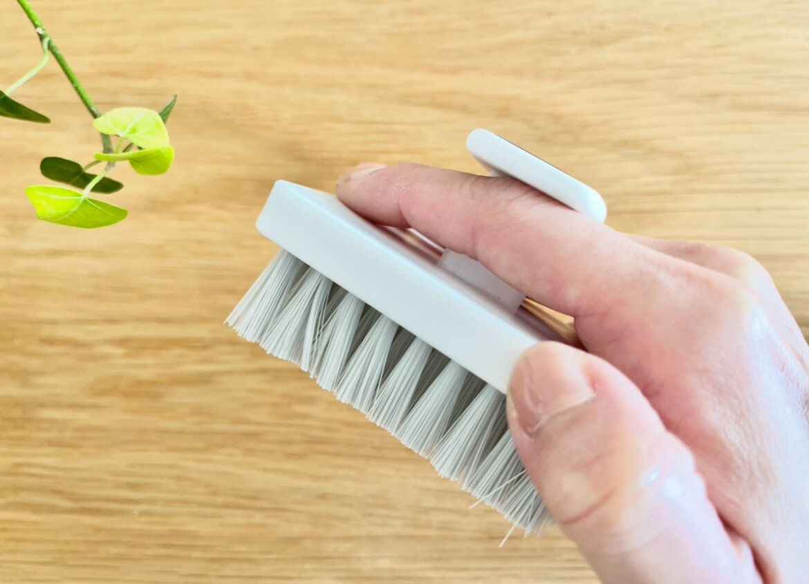 サイズは約6cm×8cm×6cm。スクエアタイプのブラシなので、角の部分も洗いやすいのが特徴です。更に、柄の部分を指でしっかり挟んで持てるので力を入れやすく、手軽に頑固な汚れをお掃除することができます。