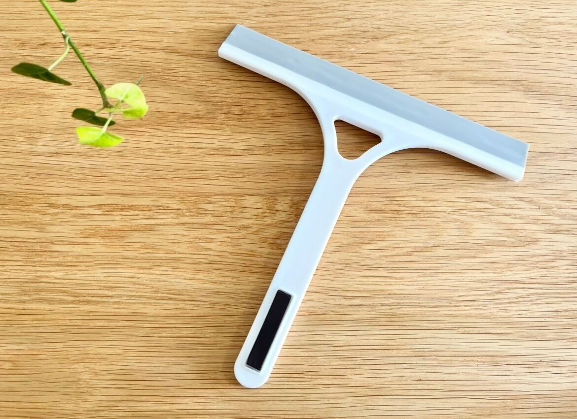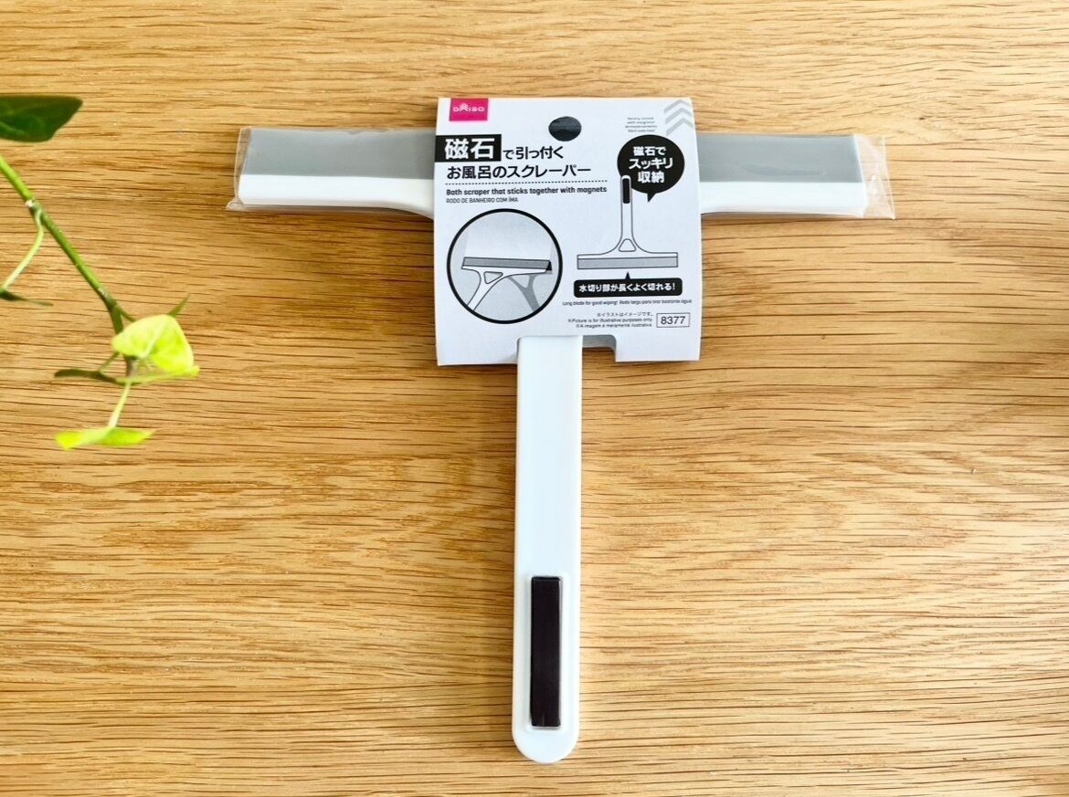 こちらは、「磁石で引っ付くお風呂のスクレーパー」という商品。浴室の壁や鏡についてしまう水垢を予防するための水切りに使用します。こちらも価格は110円で販売されています。