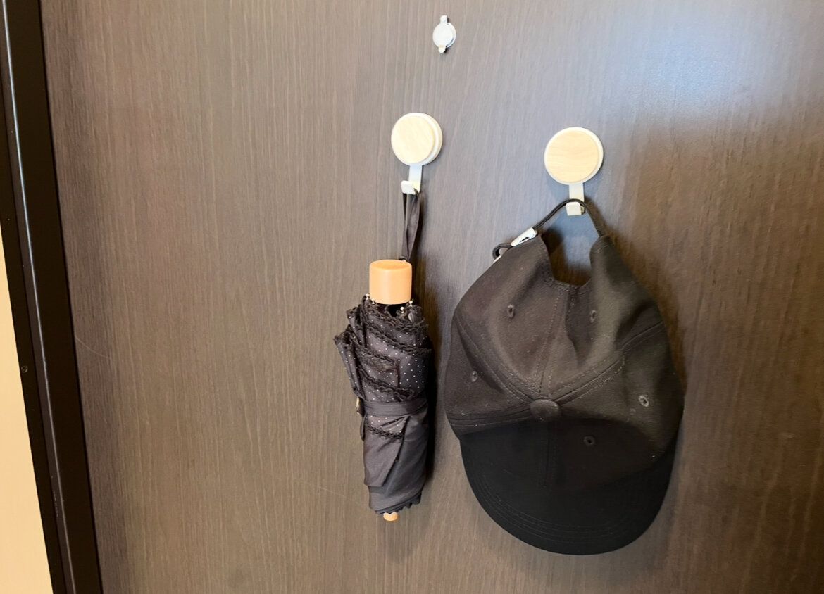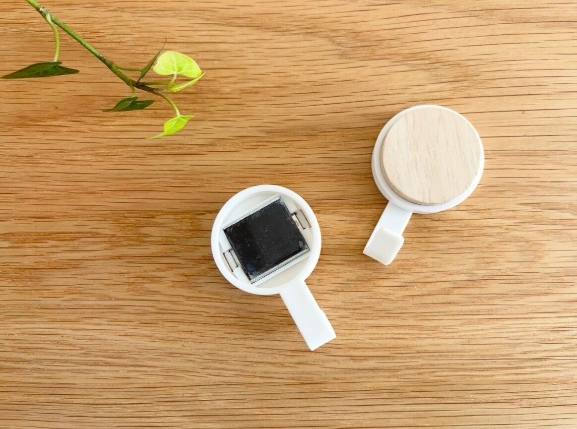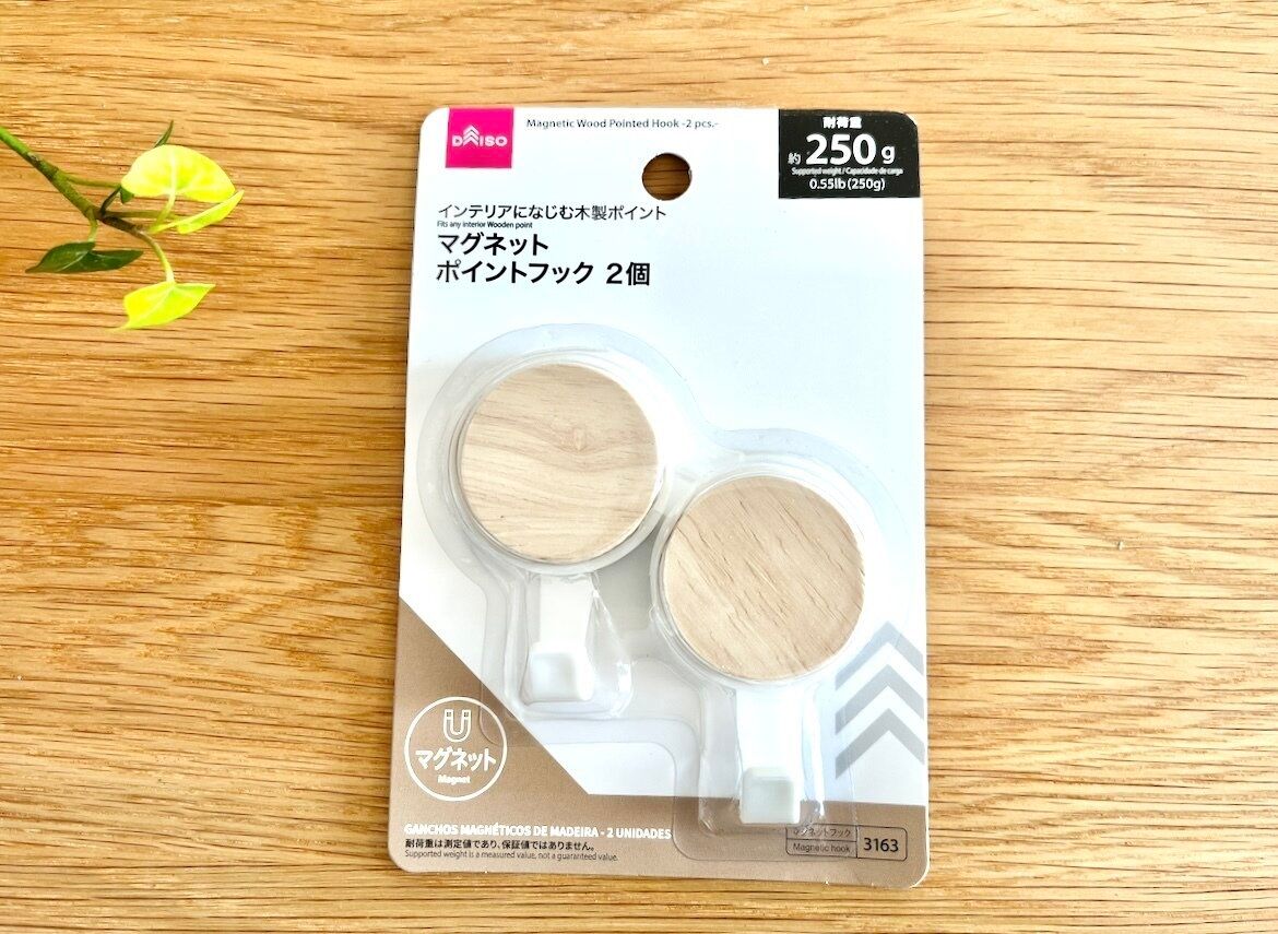 ご紹介するのは、ダイソーの「マグネットウッドポイントフック(2個)」という商品。ダイソーでもいろんな種類のフックが発売されていますが、その中でもかなり高見えのデザイン。2個入りで、価格は110円で販売されています。