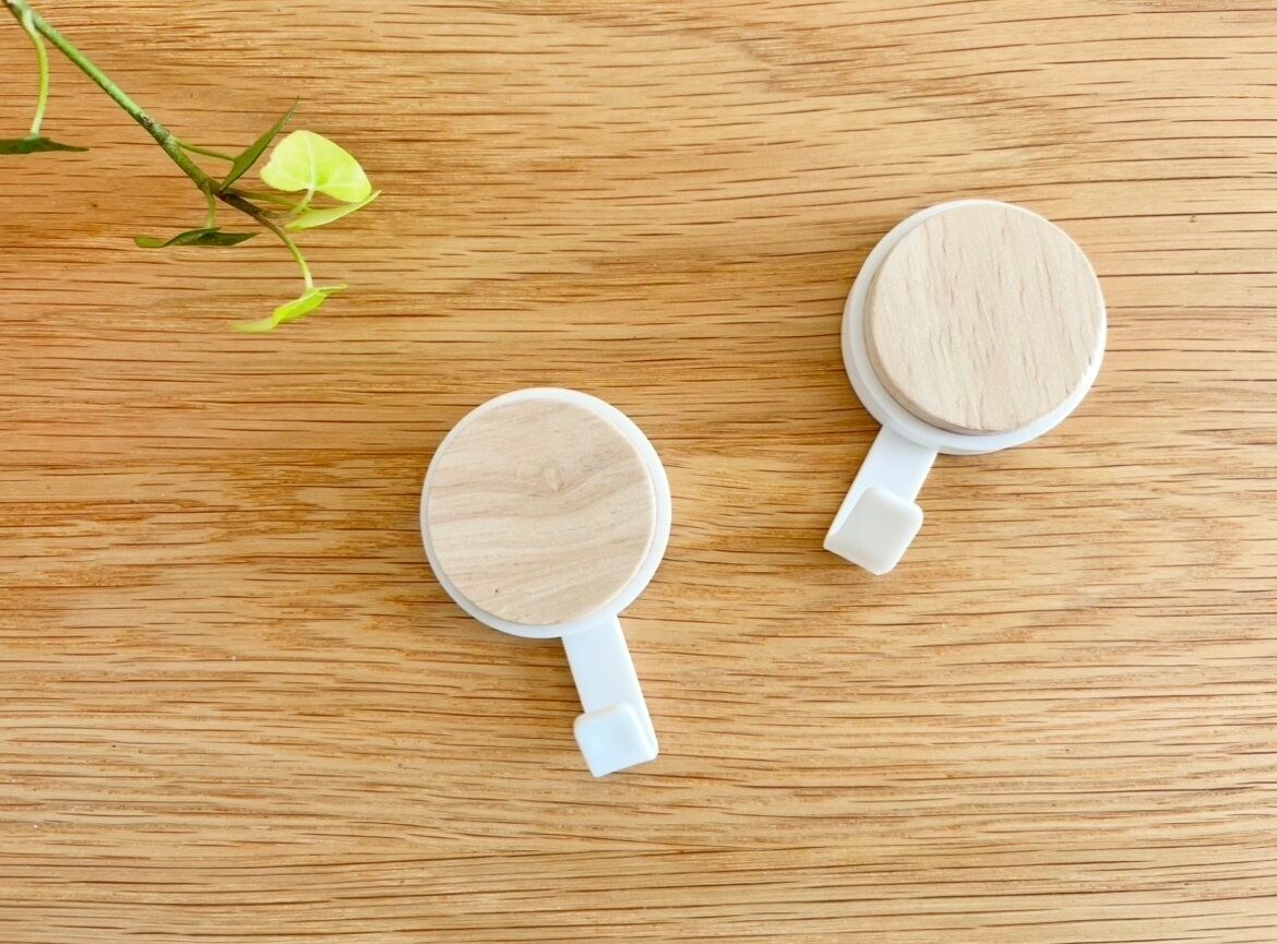 こちらの商品は、白いフックに木製の丸い飾りがアクセントとして付いているのが特徴のフックです。丸い飾りの部分は木目調のシールなどではなく、本物の木を使っているのでかなりおしゃれで高見え!まるで有名なインテリアショップなどで販売されていそうなデザインですよね。