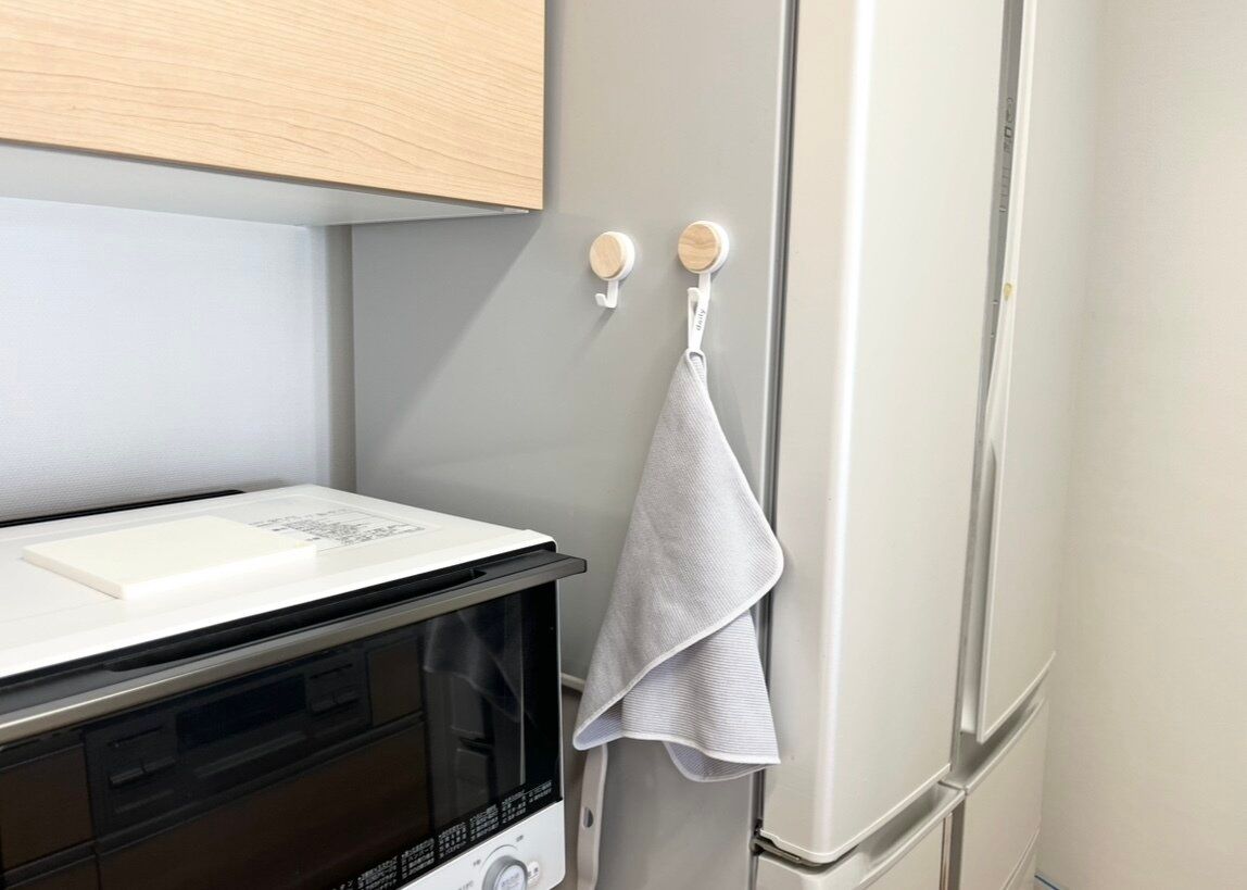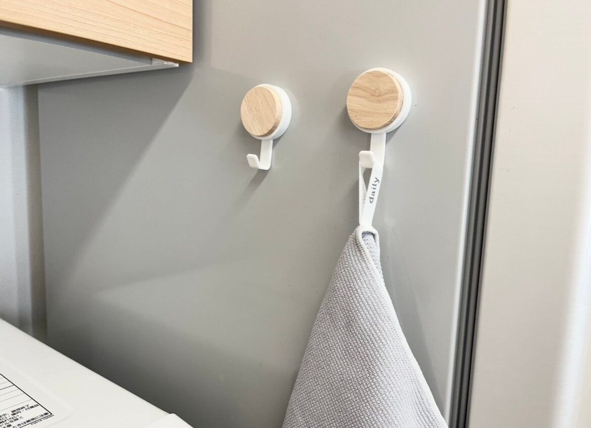 裏側にマグネットが付いているので、磁石がくっつく場所ならどこにでもペタッと手軽に貼り付けることができます。耐荷重は約250gもあるので、キッチンツールや工具などいろいろなものを吊り下げることができますよ。