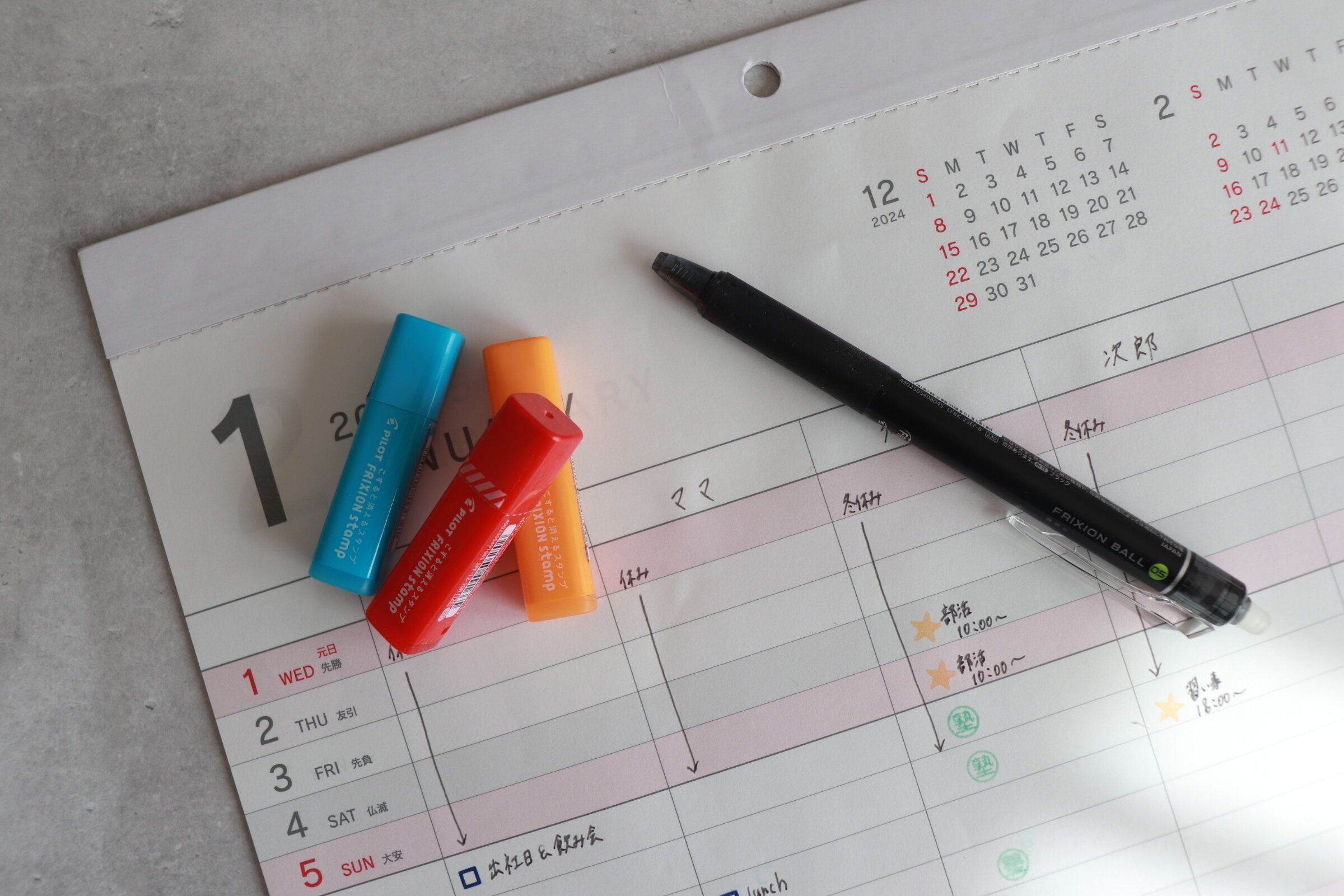 スケジュールが変更になり書いては消してを繰り返してもカレンダーがごちゃごちゃしないようフリクションのハンコを使うような工夫もしていますよ。