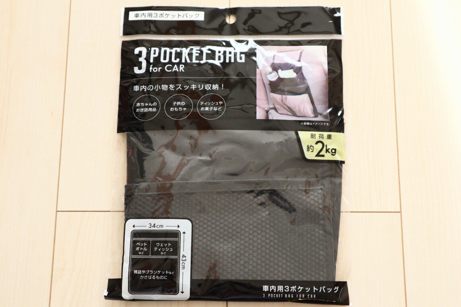 大きさの異なる3つのポケットが付いており、ペットボトルやお菓子、子どもの遊び道具などを入れるのにピッタリ!運転席や助手席の背もたれ部分に掛けられるようになっており、ベルトでしっかり固定されるので、とっても取り出しやすいですよ。