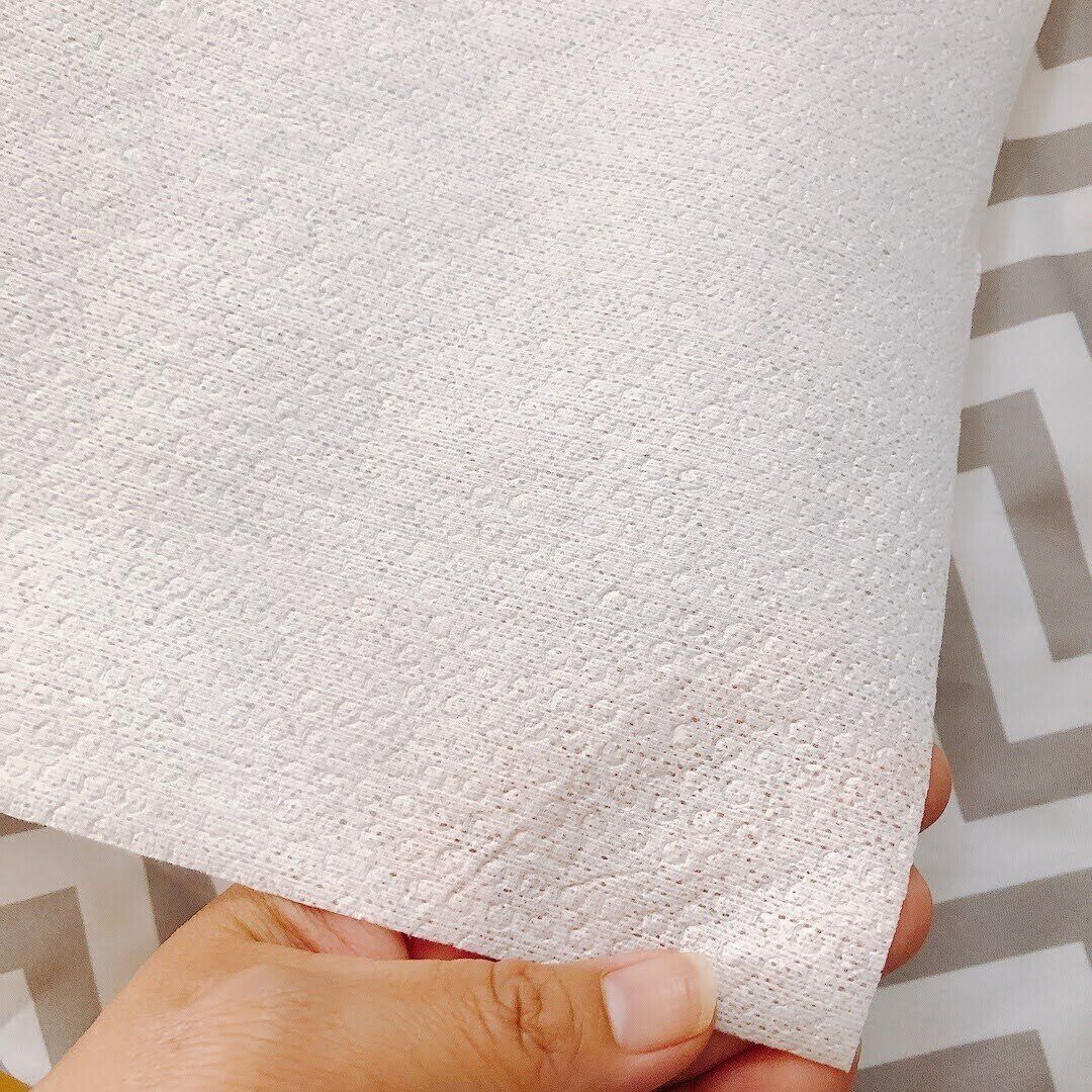 60枚がロール状につながって巻かれていて、ミシン目で1枚ずつカットして使います。1枚の大きさは27.5cm×24cm。ちょっと拭きたいときに、ちょうど良い大きさなんです。