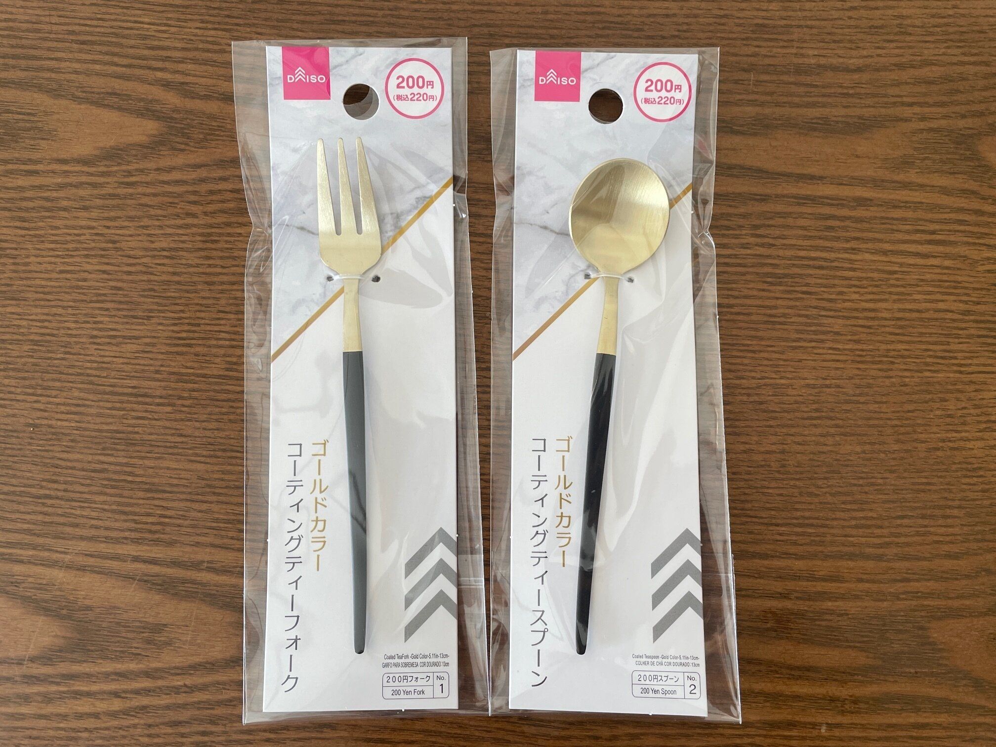 ご紹介するのは、ダイソーの「コーティングスプーン ゴールドカラー」と「コーティングフォーク ゴールドカラー」です。