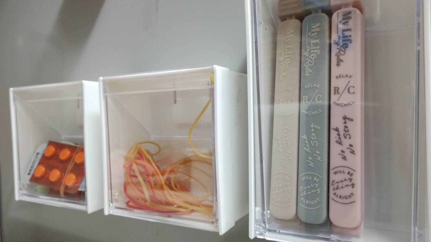 正方形のマグネットスイングケースには薬や輪ゴムを収納しています。
