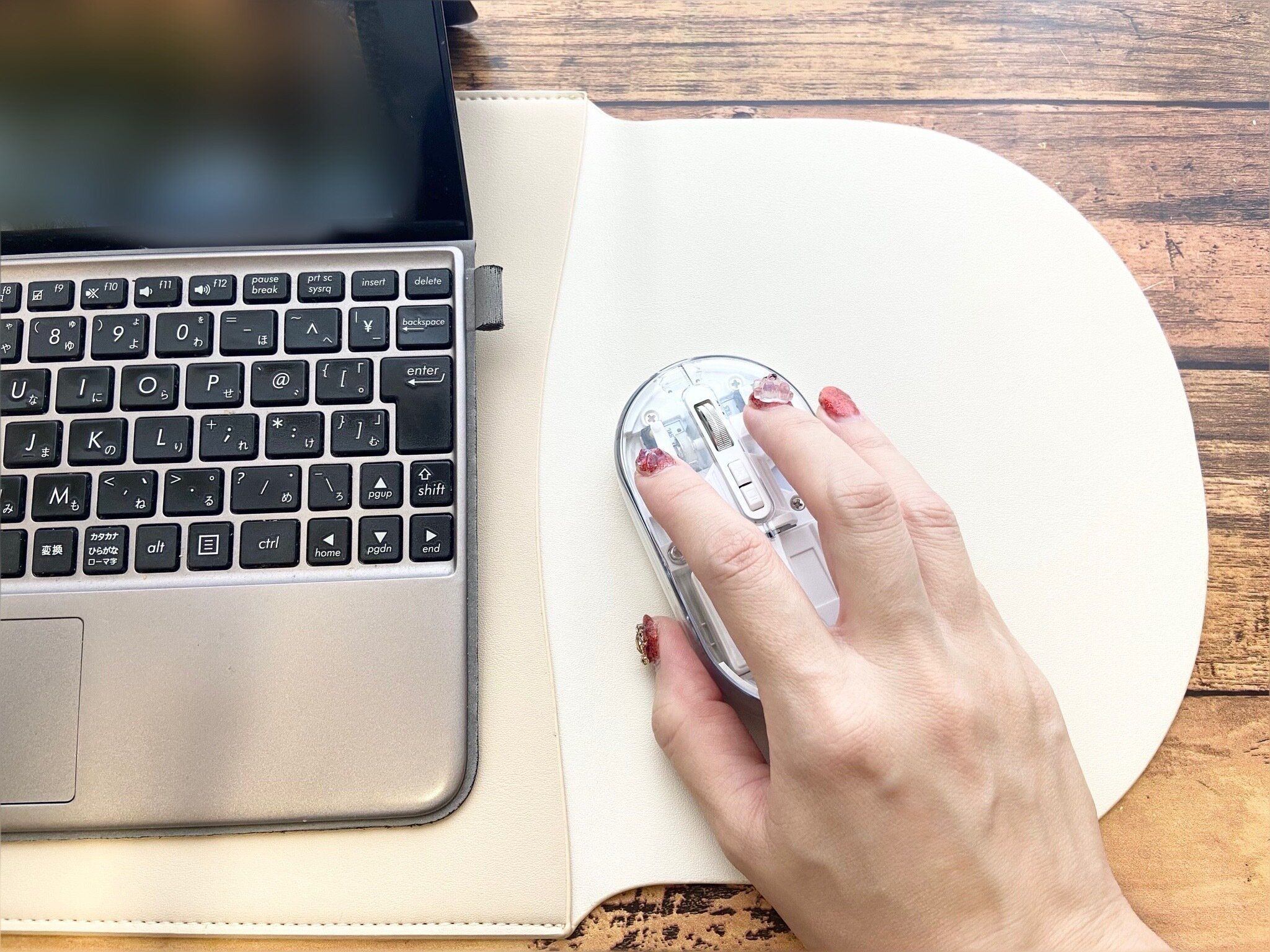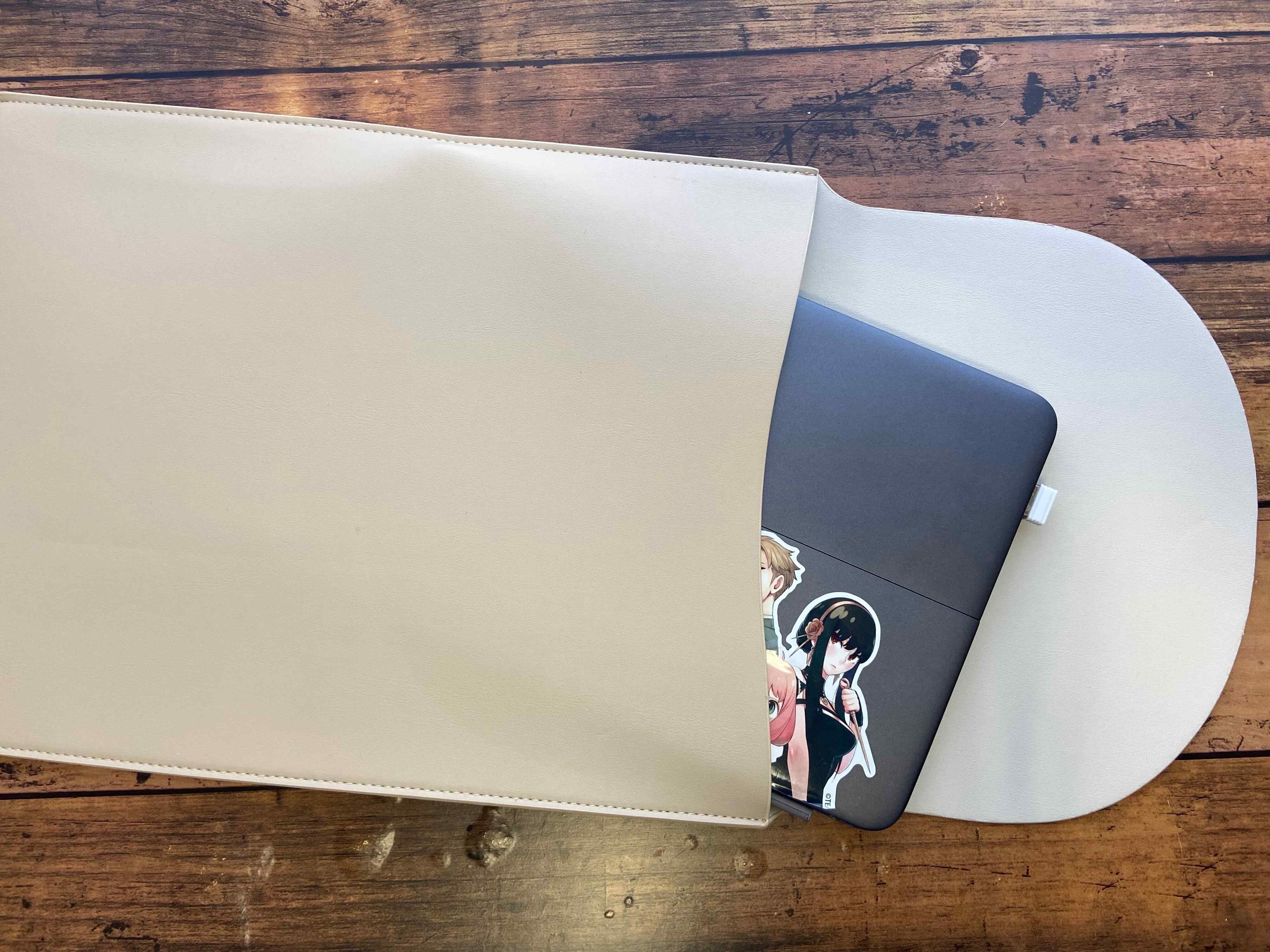 高見えデザインのおしゃれなPCケースかと思いきや、それだけではありません。いざパソコンを使用するときは、ケースの上にパソコンをセットして、蓋を開くとマウスパッドとして使用できちゃいます。マウスパッドを別で用意する必要がないので荷物が軽減できる優れもの。