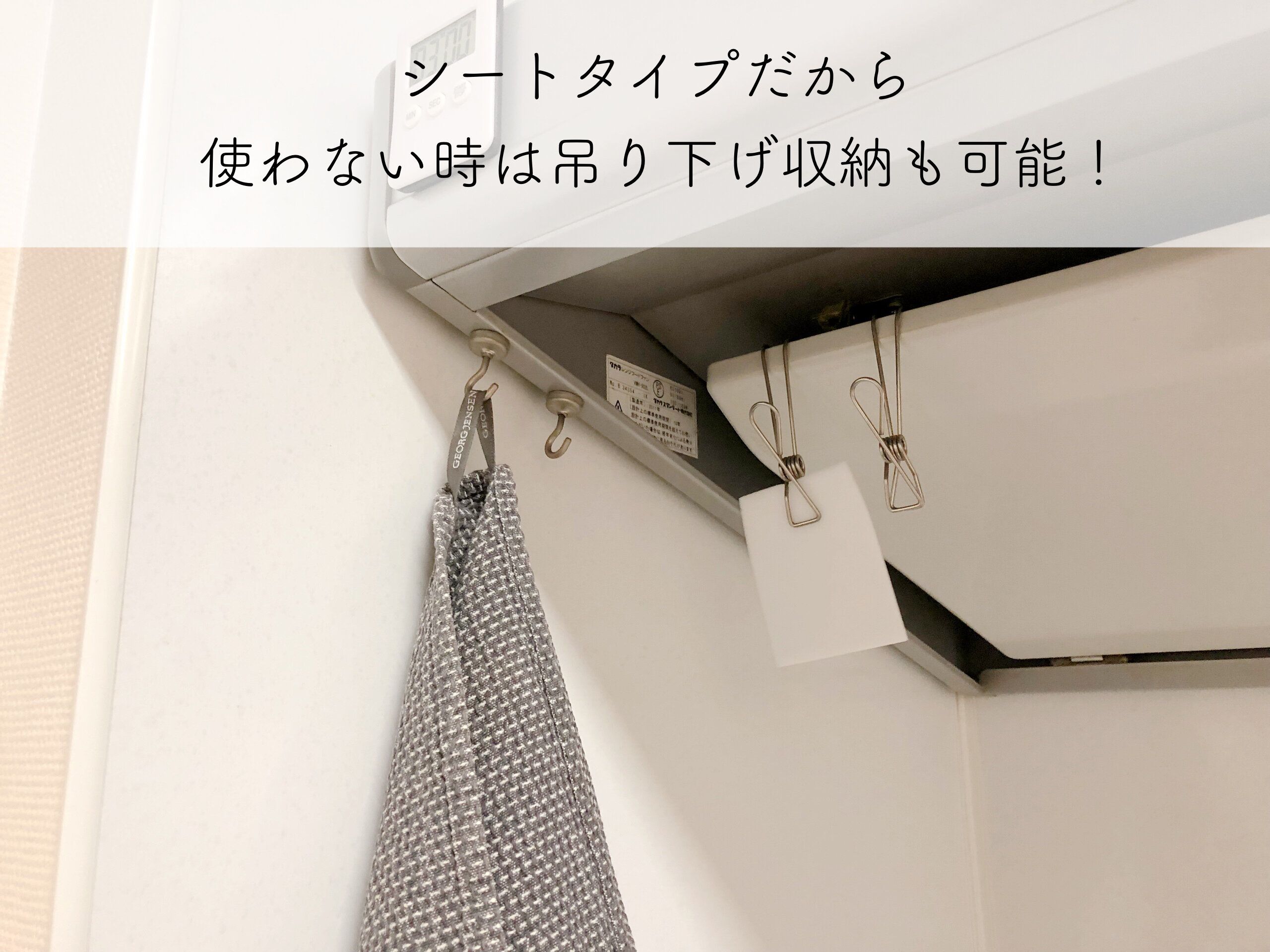 なので使った後は洗って絞ってから、水切りカゴや換気扇周りなどに引っ掛けておくと邪魔にならないし、水も切れるのでお勧めです。