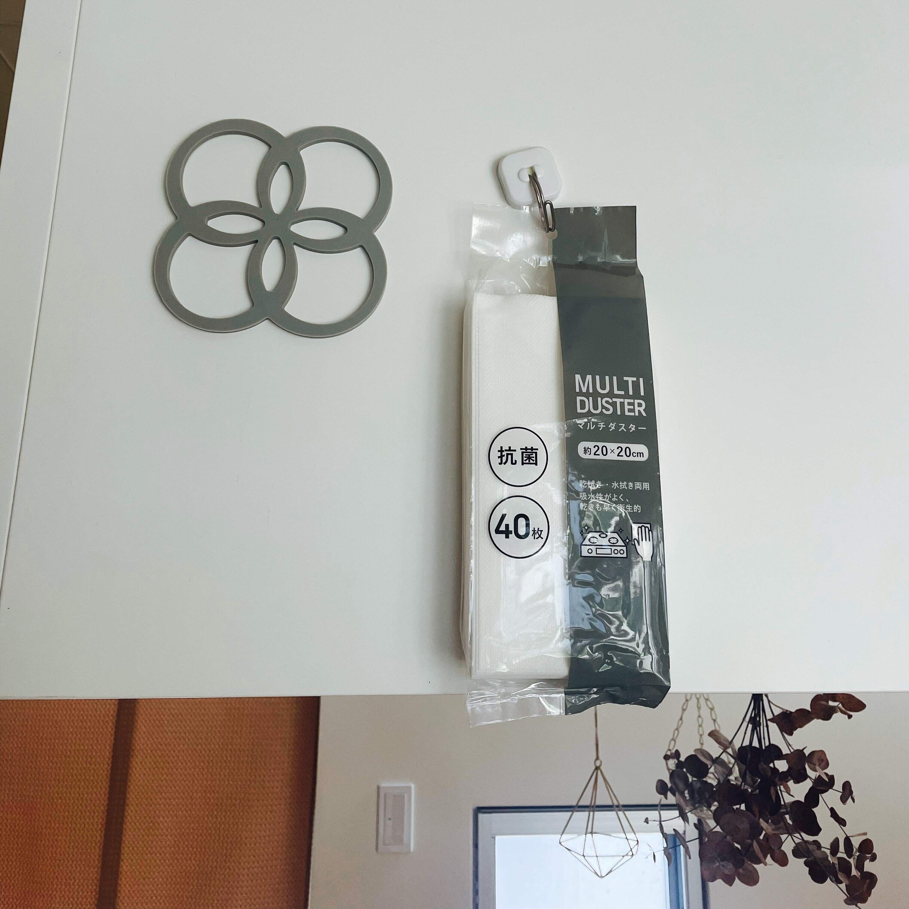 パッケージ上部には穴が空いているので、レンジフードにフックを取り付けて吊り下げ収納も出来ますよ!