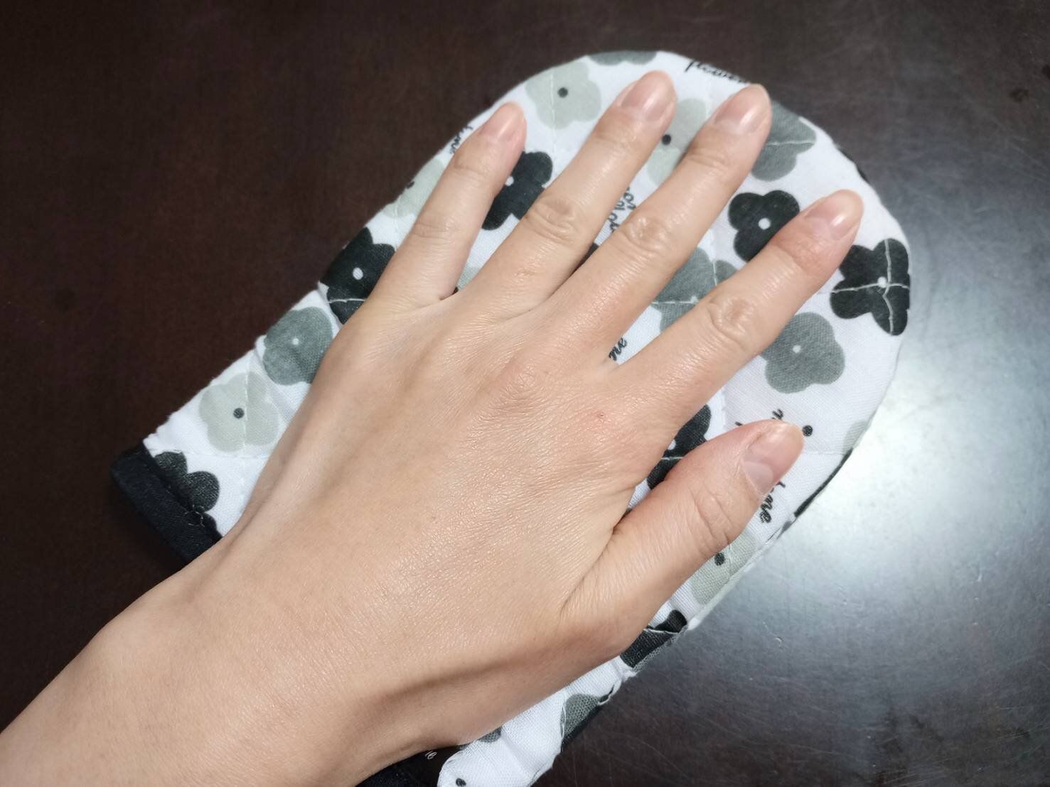 今まで典型的な大きいサイズの鍋つかみを使っていたのですが、よく考えるとこのくらいの大きさで十分だし、余計な部分を覆わない方が手を動かしやすいのです。