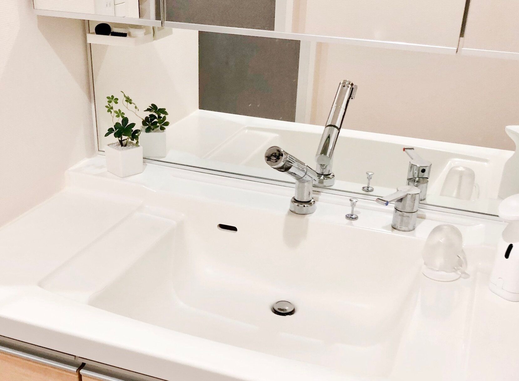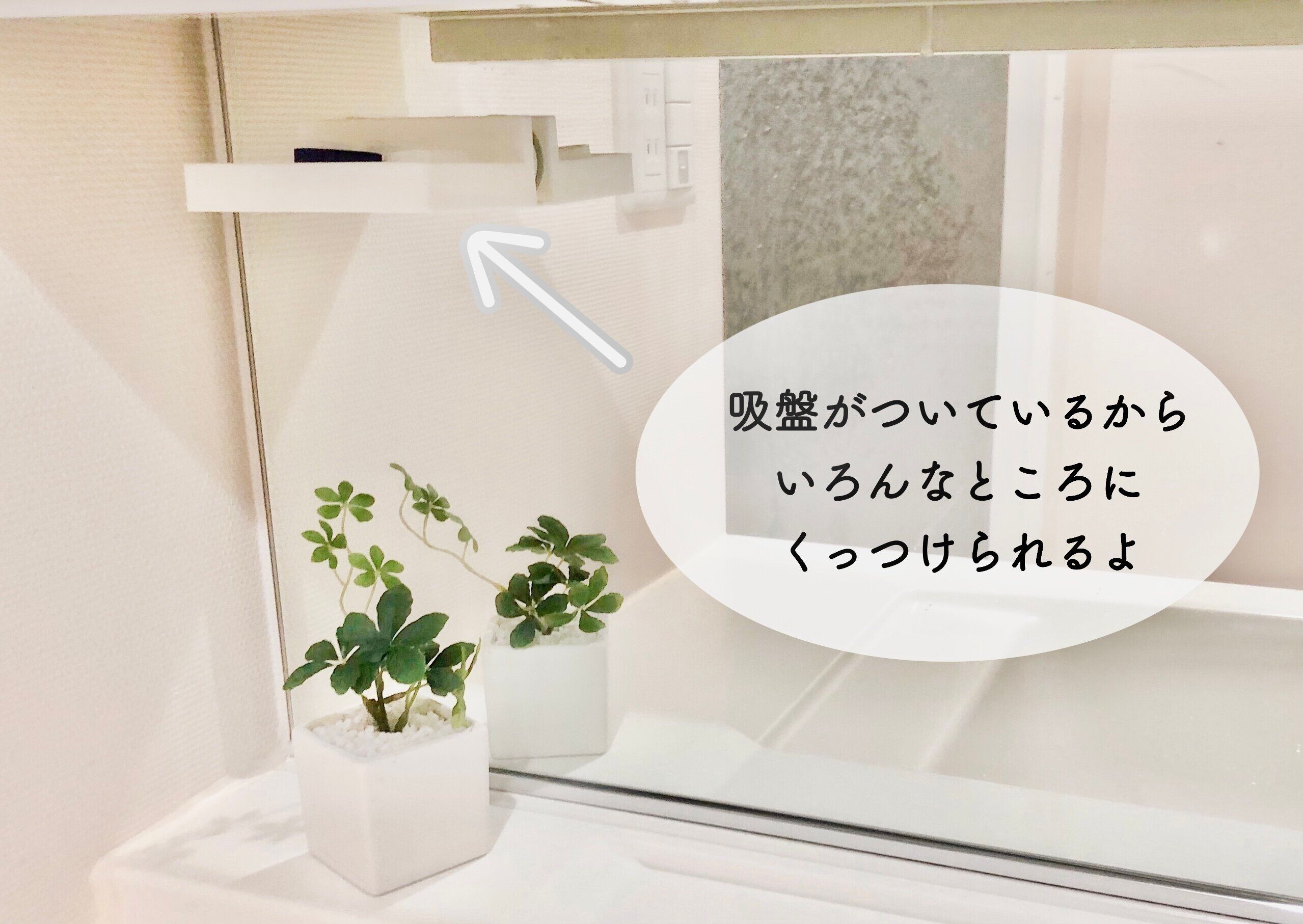 ポイントは、洗面台の前に立った時に見えにくいような場所にくっつけること。