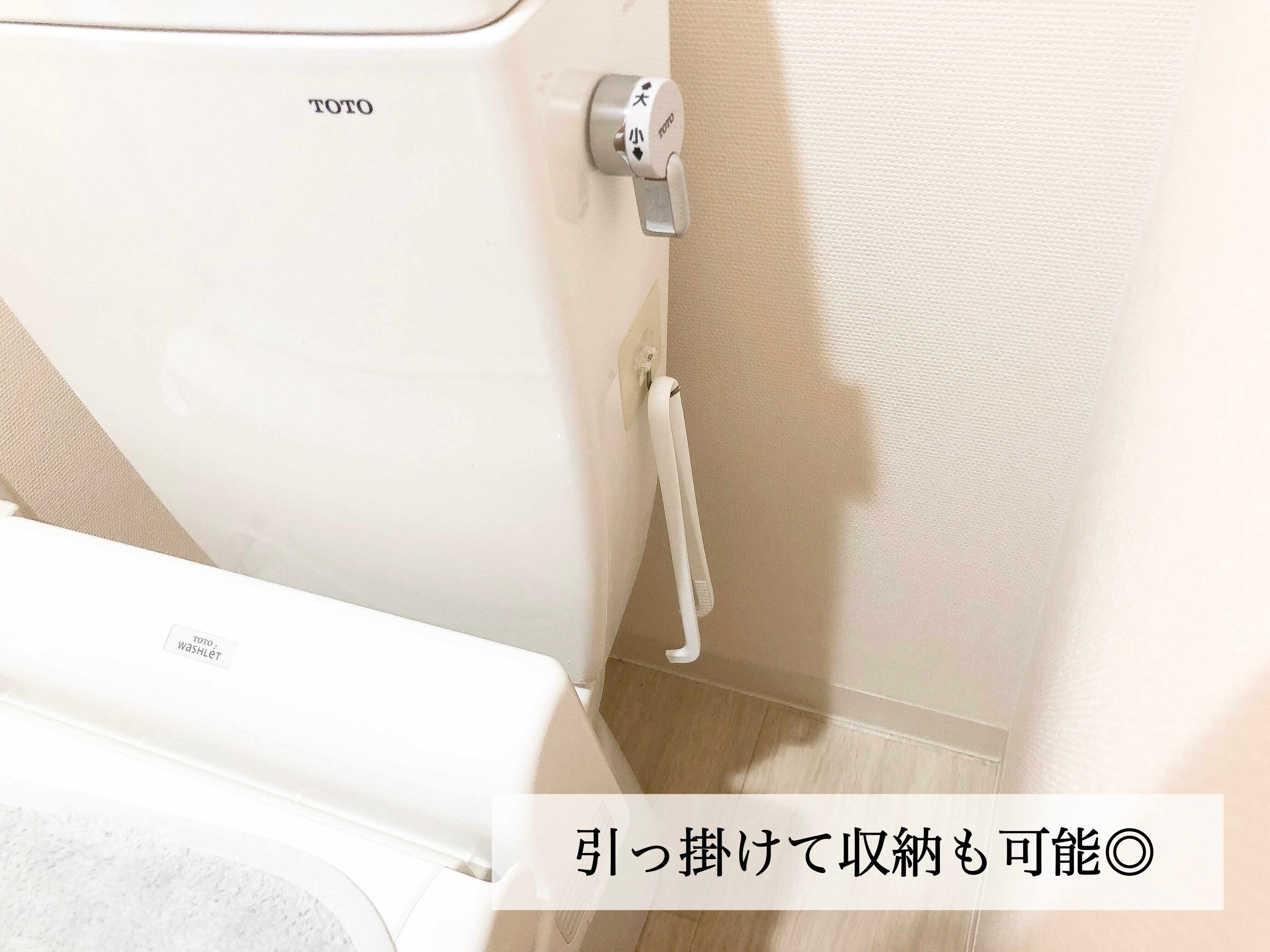 ちなみに我が家では、専用ケースは使わずに、セリアの「貼ってはがせるフック」を便器に貼って、引っ掛けて収納しています。