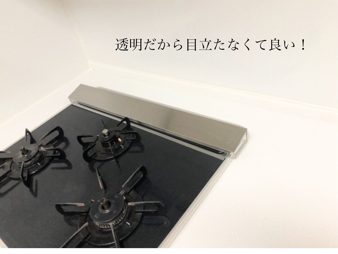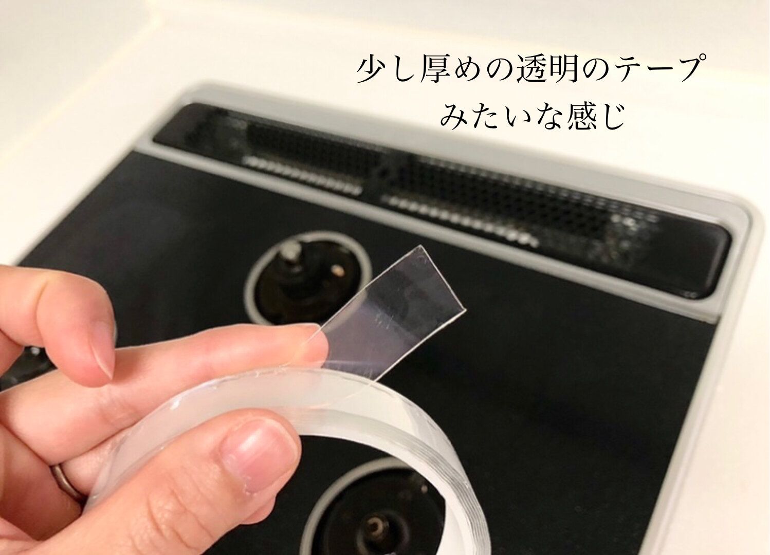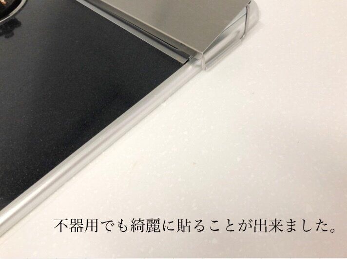 見た目は少し厚みのある透明のテープみたいな感じです。テープ自体に適度な幅があるので、コンロ周りの溝に貼ることで、溝に汚れが入り込むのを防ぐことができるんです。